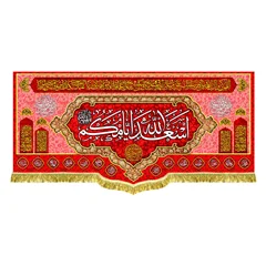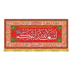 کتیبه ( پرچم ) مخمل اسعدالله ایامکم به همراه اسامی چهارده معصوم (ع) و دعای فرج ، صلوات - مناسب مجالس شادی و ولادت در ابعاد مختلف ، پارچه مخمل قابل شستشو با بهترین کیفیت چاپ و پارچه، همراه با دور دوزی و ریشه دوزی می باشد. این محصول از طراحی تا چاپ به طور کامل در انتشارات مشهور به تولید رسیده است.