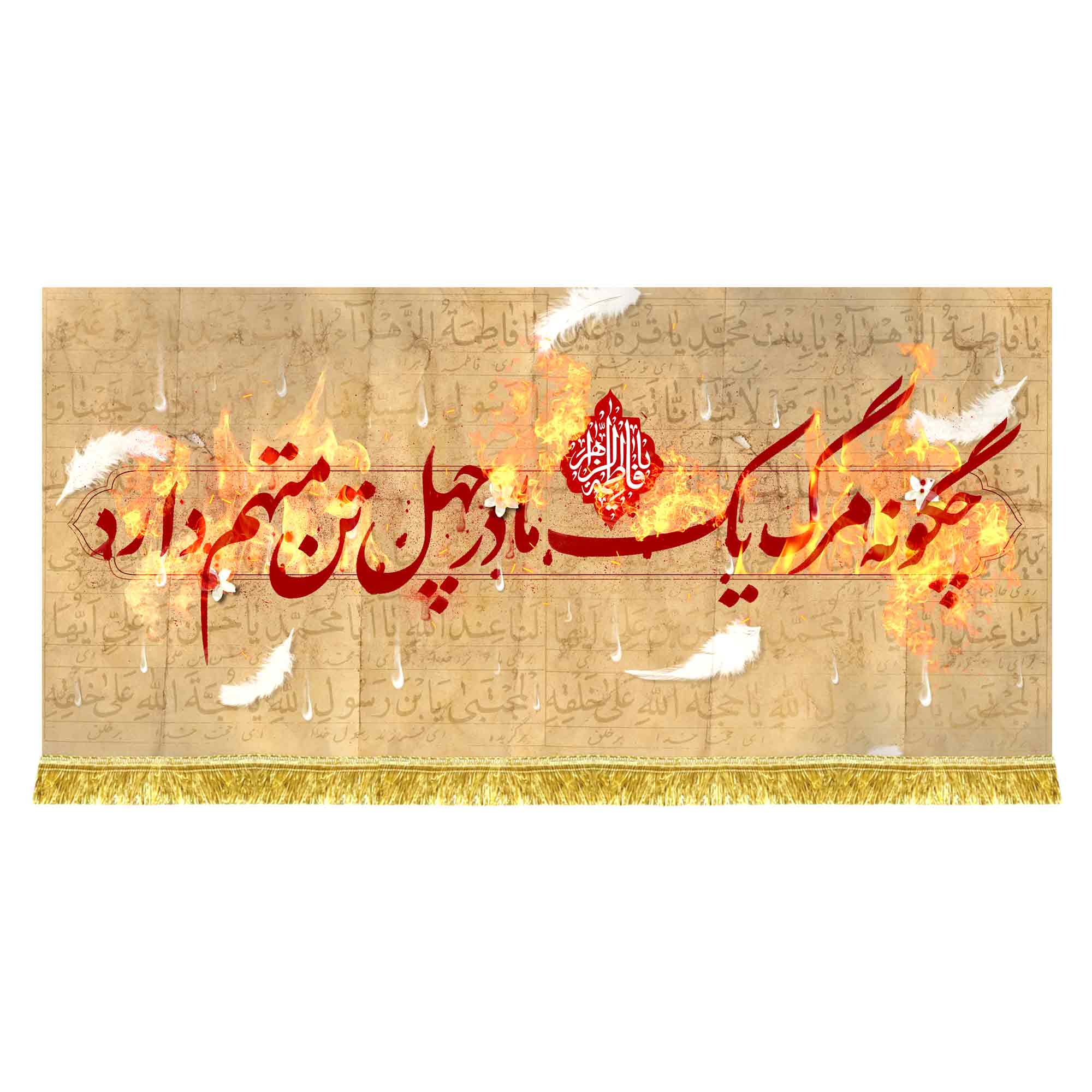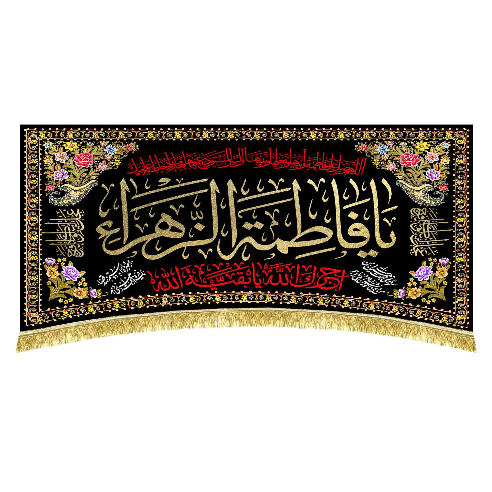 کتیبه ( پرچم ) مخمل نقاشی شهادت حضرت فاطمه زهرا (س) { السلام علیک یا فاطمه الزهرا (س) } که شامل نقاشی ضربت خوردن حضرت فاطمه زهرا (س) در پشت درب سوخته و تشییع پیکر مطهر حضرت فاطمه زهرا (س) و تدفین حضرت فاطمه زهرا (س) توسط امیرالمومنین علی (ع) می باشد، مناسب منازل و هیئات مذهبی که در ابعاد مختلف قابل سفارش است. استفاده شده از پارچه مخمل قابل شستشو با بهترین کیفیت چاپ و پارچه، همراه با دور دوزی و ریشه دوزی می باشد که توسط انتشارات مشهور به تولید رسیده است.