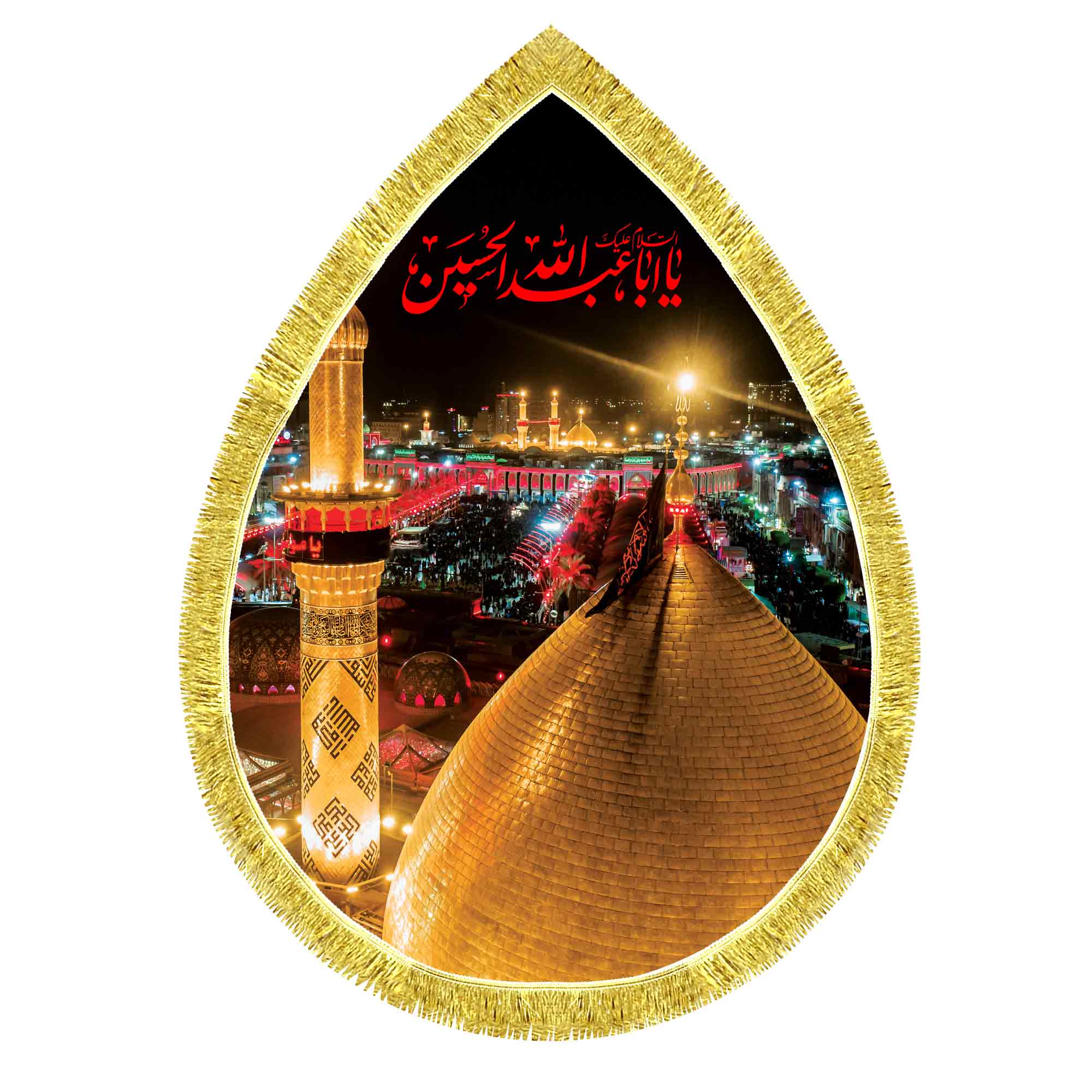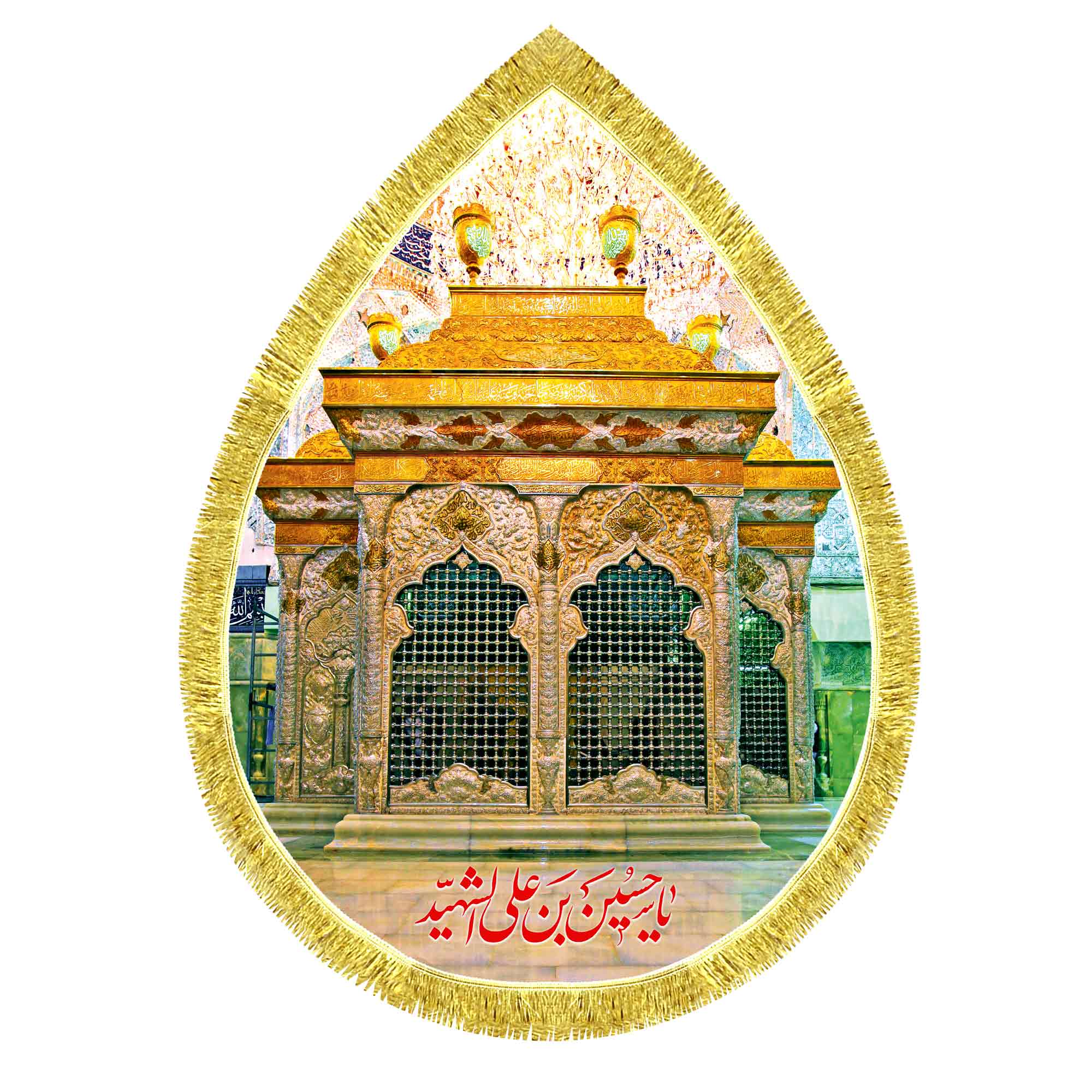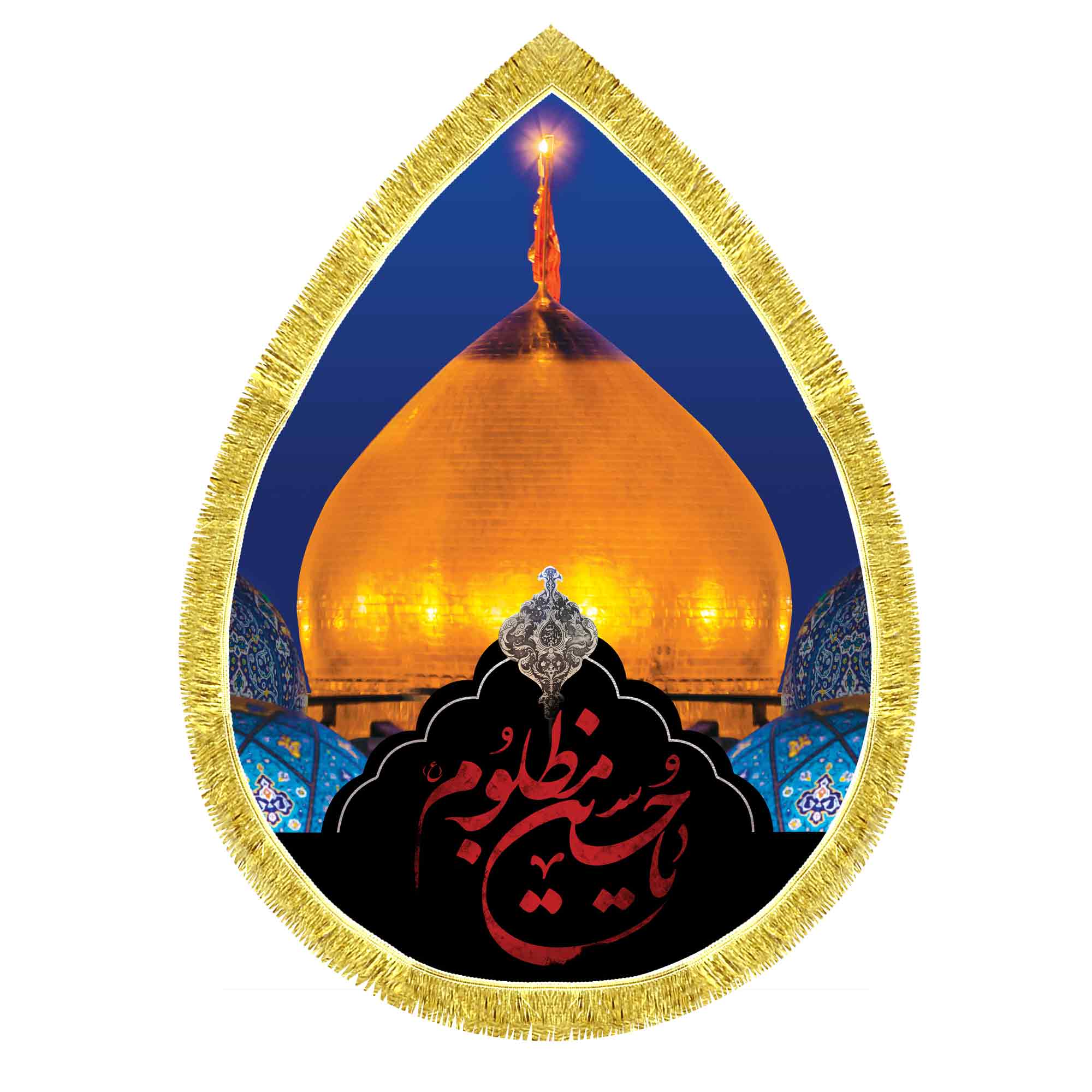 کتیبه ( پرچم ) مخمل ضریح حرم امام حسین (ع) در کربلای معلی که در ابعاد مختلف قابل سفارش است. استفاده شده از پارچه مخمل قابل شستشو با بهترین کیفیت چاپ و پارچه، که همراه با دور دوزی و ریشه دوزی می باشد. این محصول از طراحی تا چاپ به طور کامل در انتشارات مشهور به تولید رسیده است.