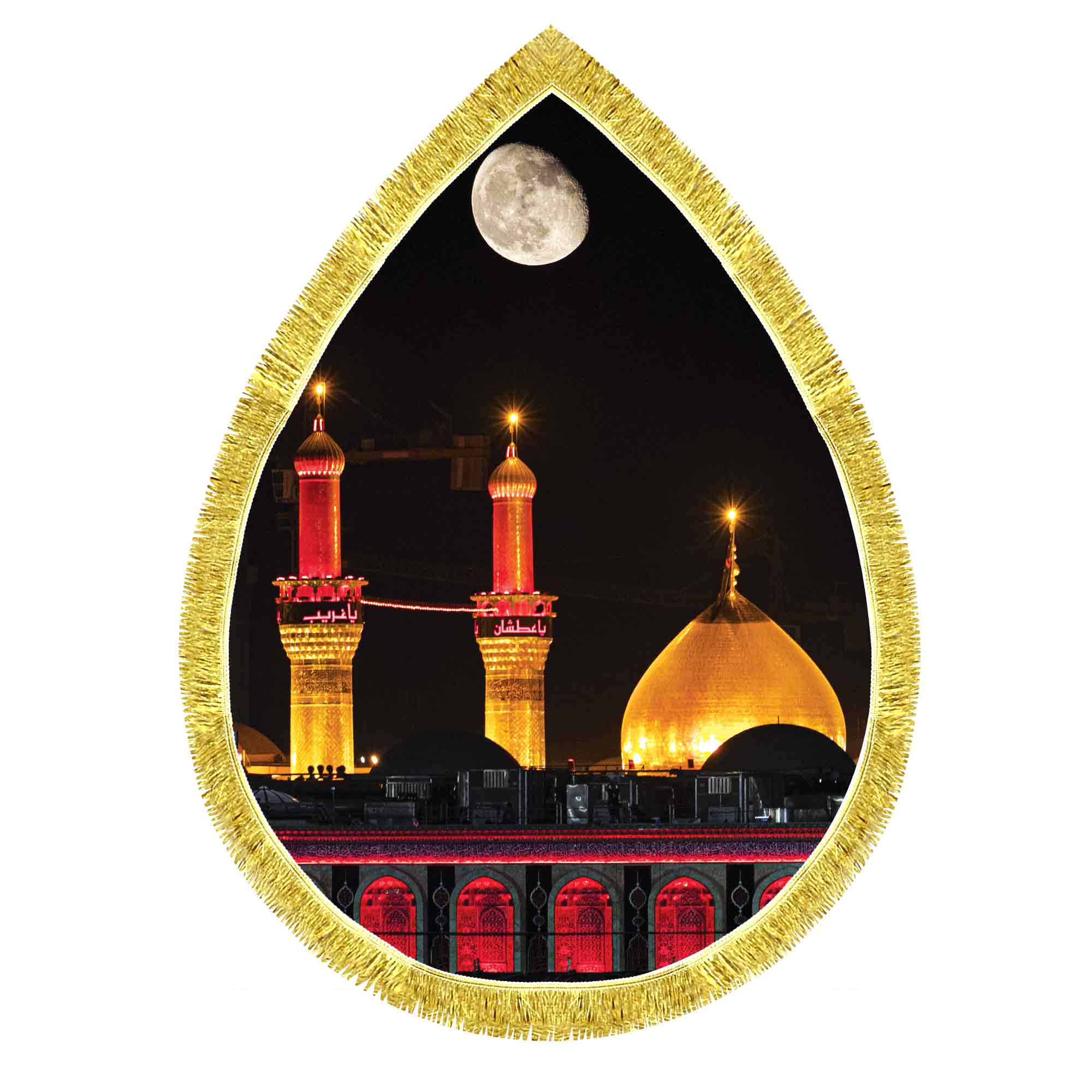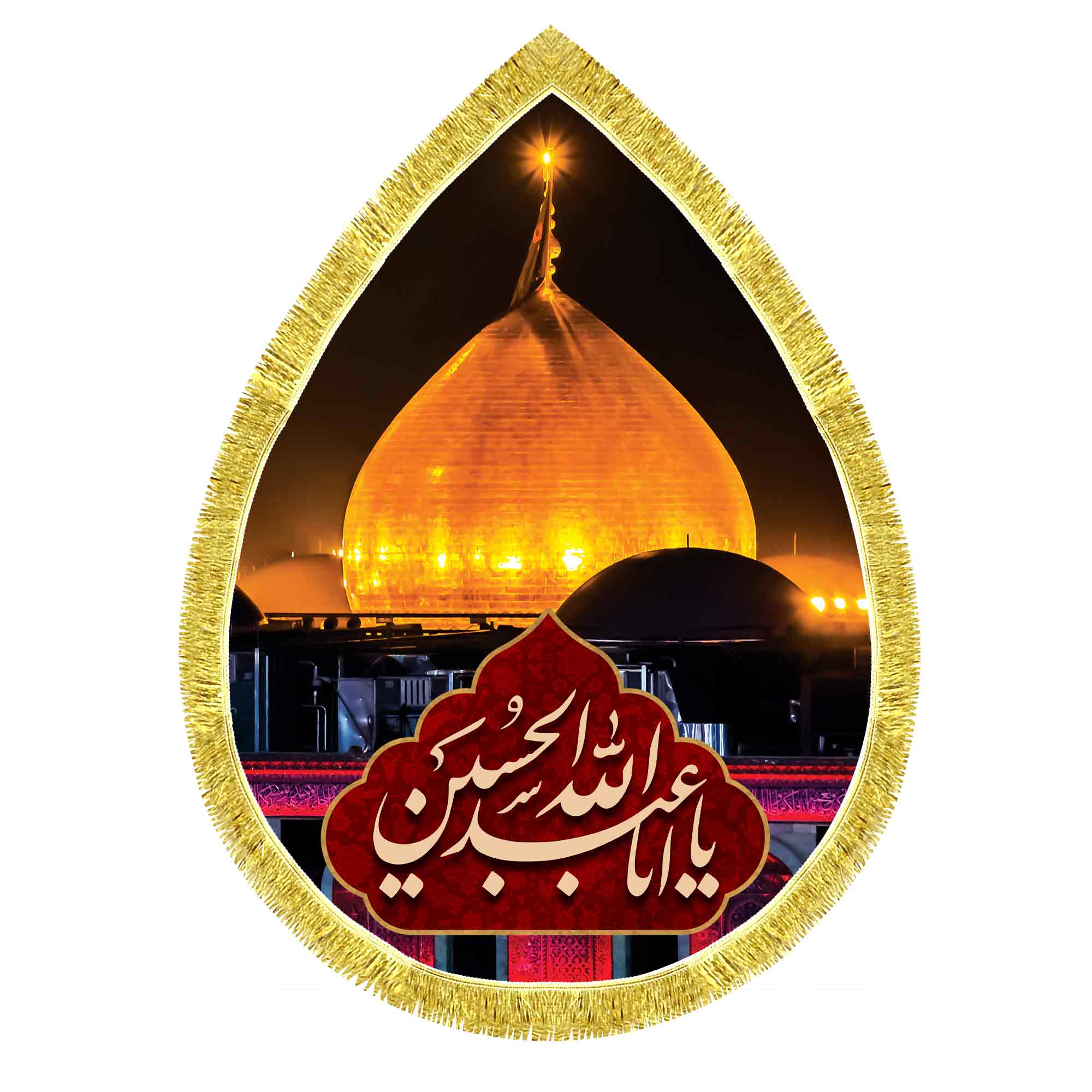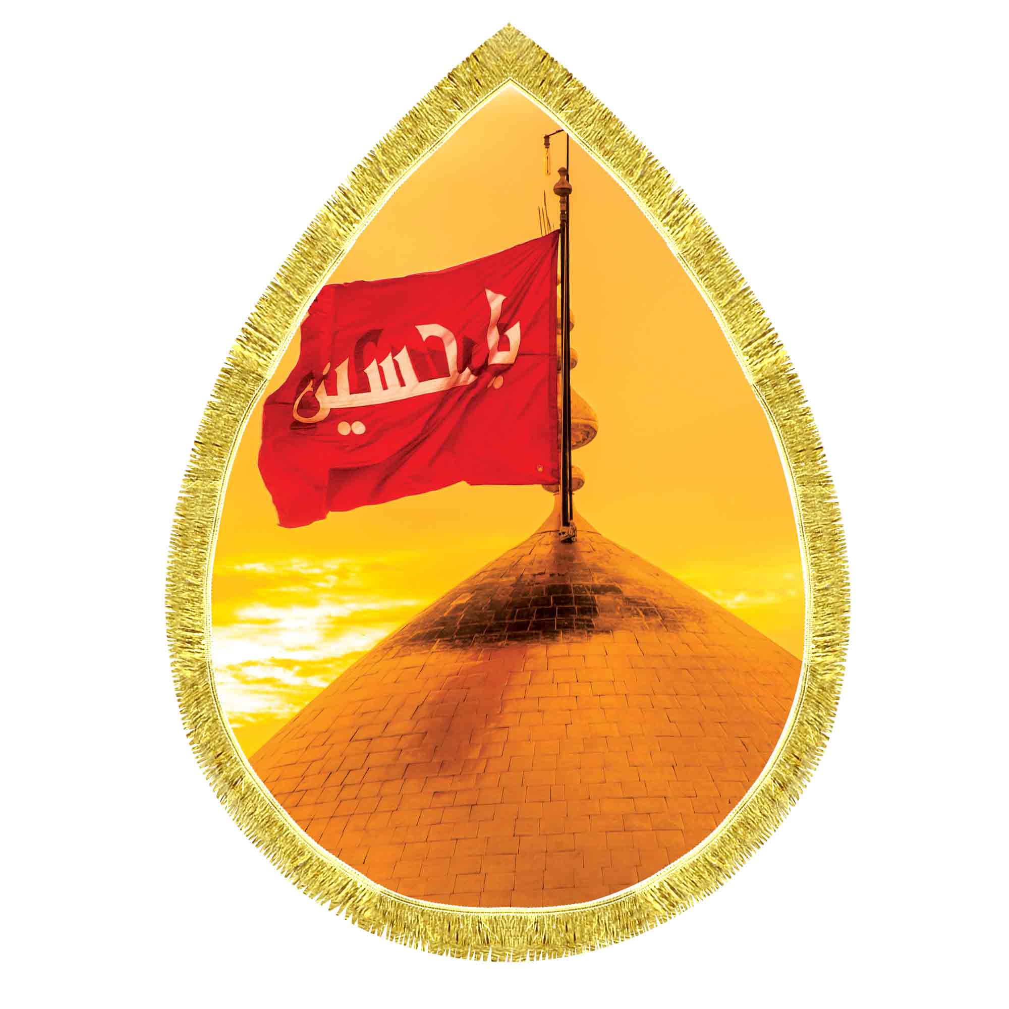 کتیبه ( پرچم ) مخمل ضریح حرم امام حسین (ع) در کربلای معلی که در ابعاد مختلف قابل سفارش است. استفاده شده از پارچه مخمل قابل شستشو با بهترین کیفیت چاپ و پارچه، که همراه با دور دوزی و ریشه دوزی می باشد. این محصول از طراحی تا چاپ به طور کامل در انتشارات مشهور به تولید رسیده است.