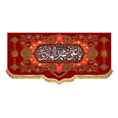 کتیبه ( پرچم ) مخمل ولادت امام هادی النقی (ع) با ذکر السلام علیک یا علی بن محمد هادی النقی (ع) به همراه اسامی چهارده معصوم (ع) و اللهم عجل لولیک الفرج ، السلام علیکم یا اهل بیت النبوه ، صلوات ، دعای سلامتی امام زمان (عج) که با طراحی جدید و رنگبندی متنوع در ابعاد مختلف قابل سفارش است. استفاده شده از پارچه مخمل درجه یک قابل شستشو با بهترین کیفیت چاپ و پارچه که همراه با دور دوزی و ریشه دوزی می باشد. این محصول از طراحی تا چاپ به طور کامل در مجموعه انتشارات مشهور به تولید رسیده است.