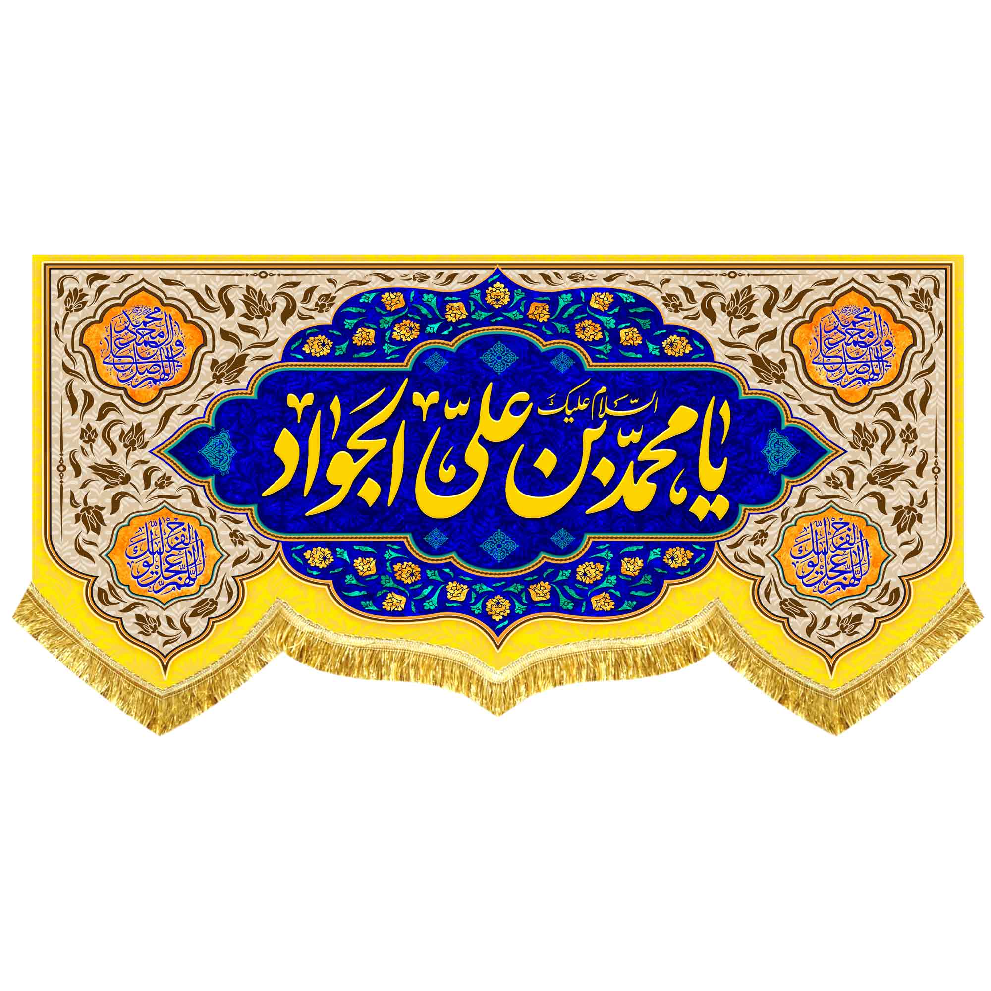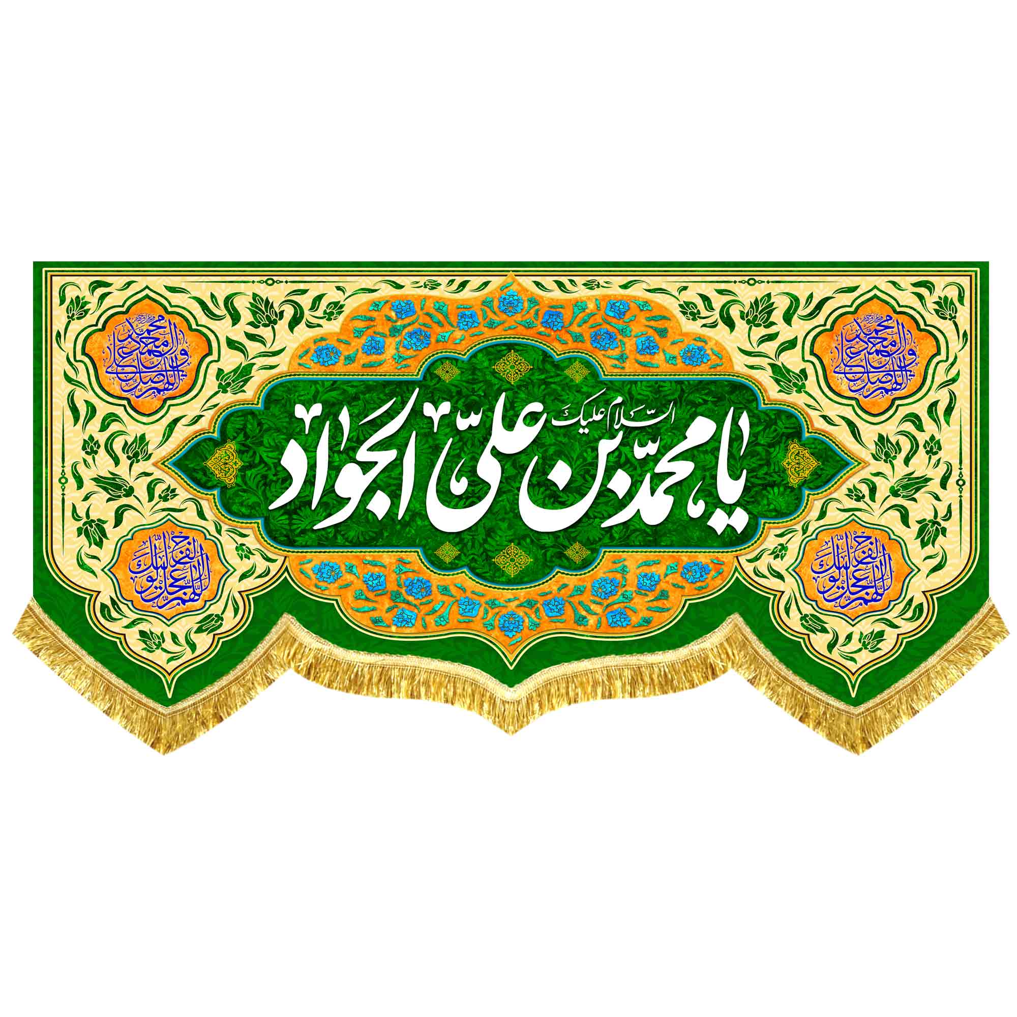کتیبه ( پرچم ) مخمل ولادت امام جواد (ع) با ذکر السلام علیک یا جواد الائمه (ع) و ذکر یا علی بن الحسین الاصغر (ع) به همراه اسامی چهارده معصوم (ع) ، صلوات که با طراحی جدید و رنگبندی متنوع مناسب ولادت حضرت جواد الائمه (ع) و حضرت علی اصغر (ع) در ابعاد مختلف قابل سفارش است. استفاده شده از پارچه مخمل درجه یک قابل شستشو با بهترین کیفیت چاپ و پارچه که همراه با دور دوزی و ریشه دوزی می باشد. این محصول از طراحی تا چاپ به طور کامل در مجموعه انتشارات مشهور به تولید رسیده است.