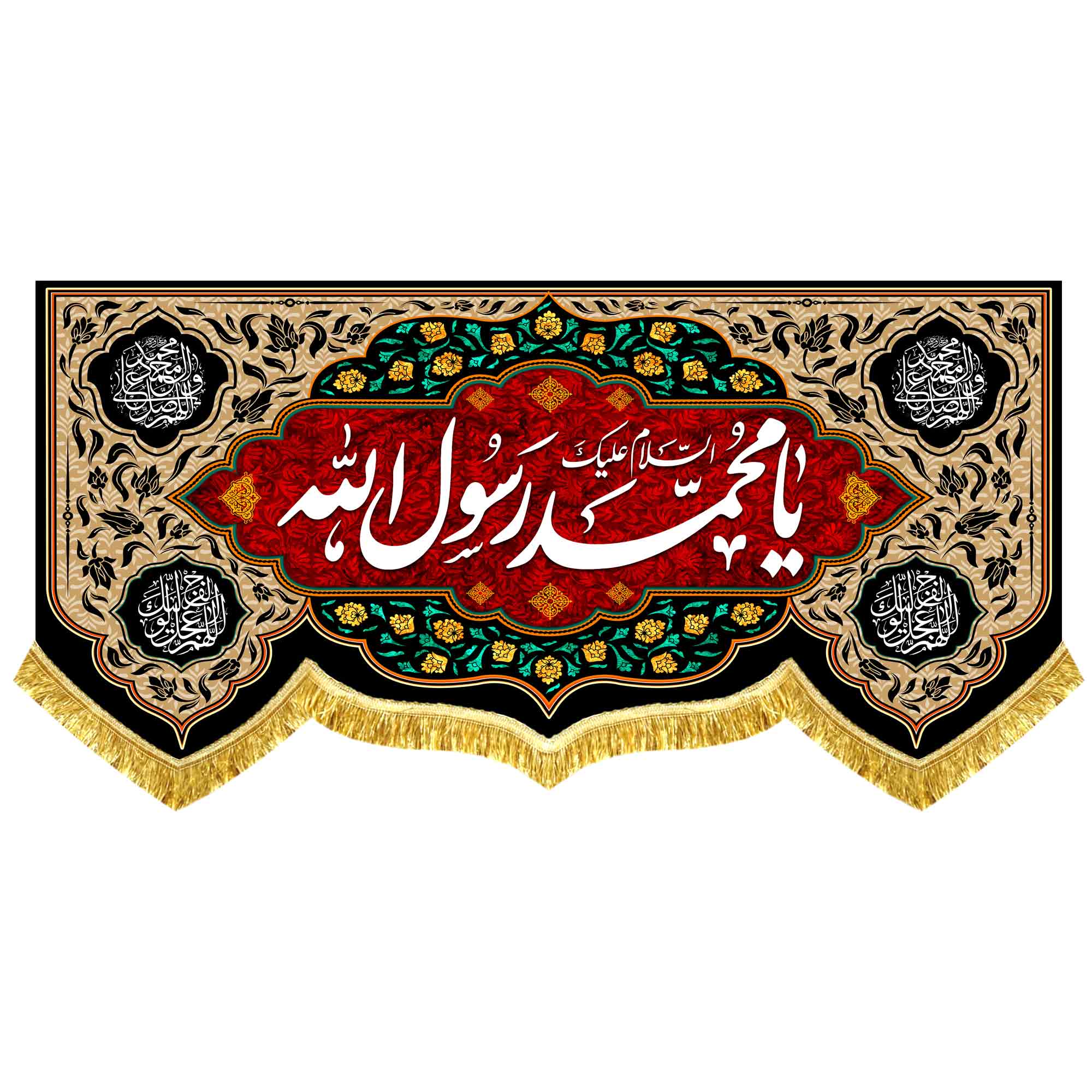 کتیبه ( پرچم ) مخمل ایام شهادت ماه صفر با ذکر السلام علیک یا ابوالقاسم یا رسول الله (ص) و السلام علیک یا حسن بن علی المجتبی (ع) و السلام علیک یا علی بن موسی الرضا (ع) به همراه اسامی چهارده معصوم (ع) ، اللهم عجل لولیک الفرج ، اللهم صل علی محمد و آل محمد (ص) که با طراحی جدید و رنگبندی متنوع مناسب ایام شهادت 28 صفر رحلت پیامبر اکرم (ص) و شهادت امام حسن مجتبی (ع) و شهادت امام رضا (ع) در ابعاد مختلف قابل سفارش است. استفاده شده از پارچه مخمل درجه یک قابل شستشو با بهترین کیفیت چاپ و پارچه که همراه با دور دوزی و ریشه دوزی می باشد. این محصول از طراحی تا چاپ به طور کامل در مجموعه انتشارات مشهور به تولید رسیده است.