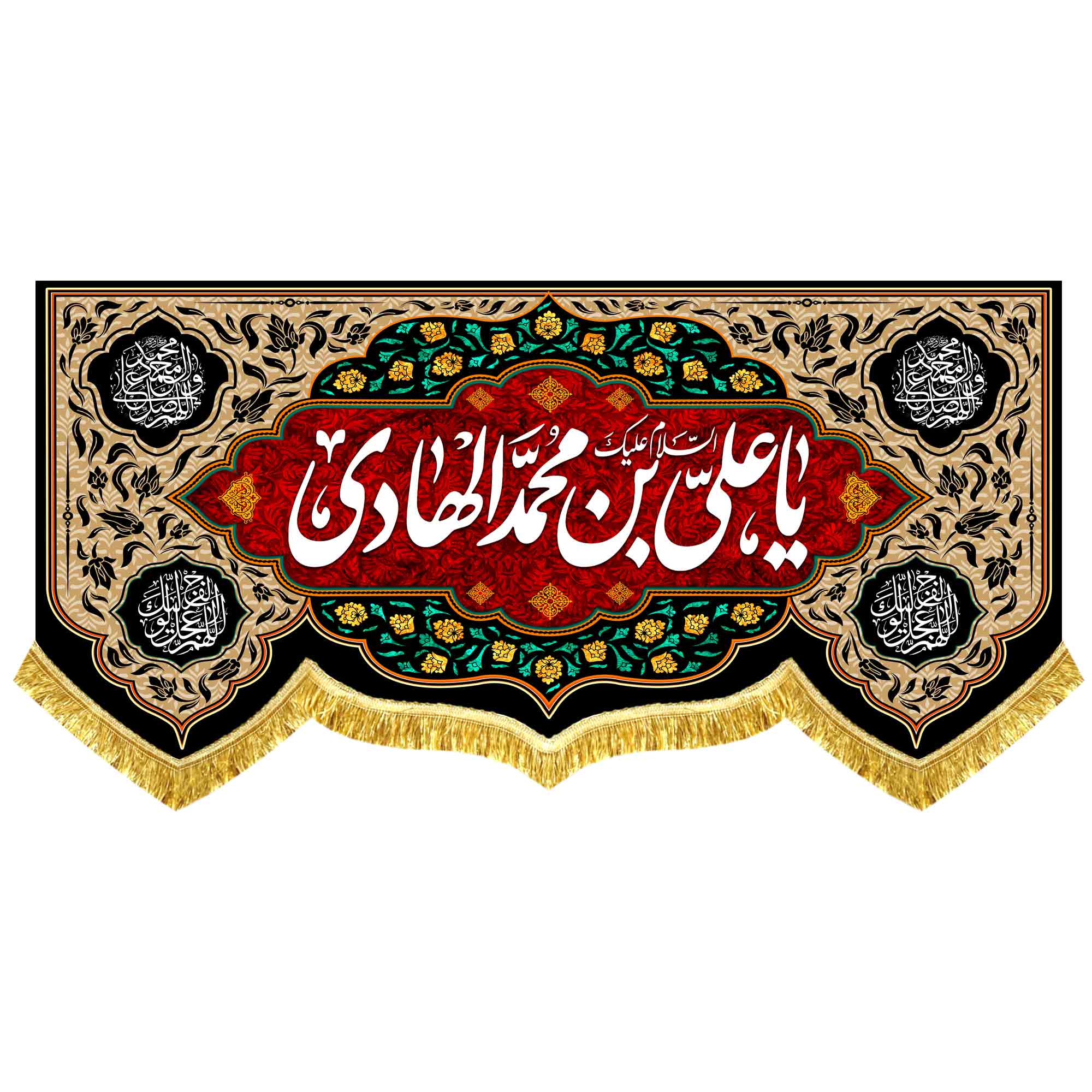 کتیبه ( پرچم ) مخمل شهادت امام هادی (ع) با ذکر یا علی بن محمد ایها الهادی النقی (ع) به همراه اسامی چهارده معصوم (ع) ، السلام علیکم یا اهل بیت النبوه ، آجرک الله یا صاحب الزمان (عج) ، اللهم عجل لولیک الفرج و دعای سلامتی امام زمان (عج) با طراحی جدید که در ابعاد مختلف قابل سفارش است. استفاده شده از پارچه مخمل قابل شستشو با بهترین کیفیت چاپ و پارچه، همراه با دور دوزی و ریشه دوزی می باشد. این محصول از طراحی تا چاپ به طور کامل در انتشارات مشهور به تولید رسیده است.