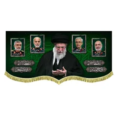 کتیبه ( پرچم ) حضرت آیت الله خامنه ای و امام خمینی (ره) به همراه شهید سید حسن نصرالله با ذکر یا اهل بیت النبوه و ما ملت امام حسین (ع) هستیم ، ما ملت شهادتیم که با طراحی جدید در ابعاد مختلف قابل سفارش است. استفاده شده از پارچه مخمل قابل شستشو با بهترین کیفیت چاپ و پارچه که همراه با دور دوزی ، ریشه دوزی و بندینک آویز می باشد. این محصول از طراحی تا چاپ به طور کامل در انتشارات مشهور به تولید رسیده است.