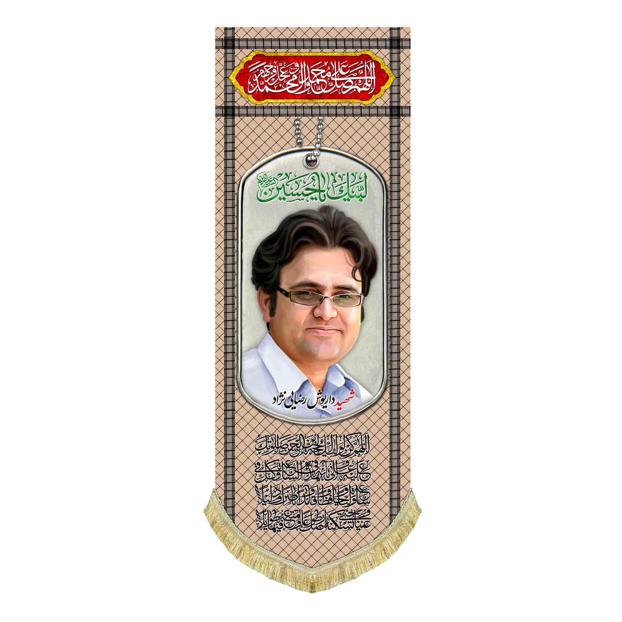 کتیبه ( پرچم ) مخمل شهید داریوش رضایی نژاد که با طراحی جدید چفیه رنگ خاکی و پلاک به همراه ذکر لبیک یا حسین (ع) ، اللهم صل علی محمد و آل محمد و عجل فرجهم و دعای سلامتی امام زمان (عج) در سایز عمودی قابل سفارش است. استفاده شده از پارچه مخمل درجه یک قابل شستشو و با بهترین کیفیت چاپ که همراه با دور دوزی ، ریشه دوزی و بندینک آویز می باشد. این محصول از طراحی تا چاپ به طور کامل در مجموعه انتشارات مشهور به تولید رسیده است.