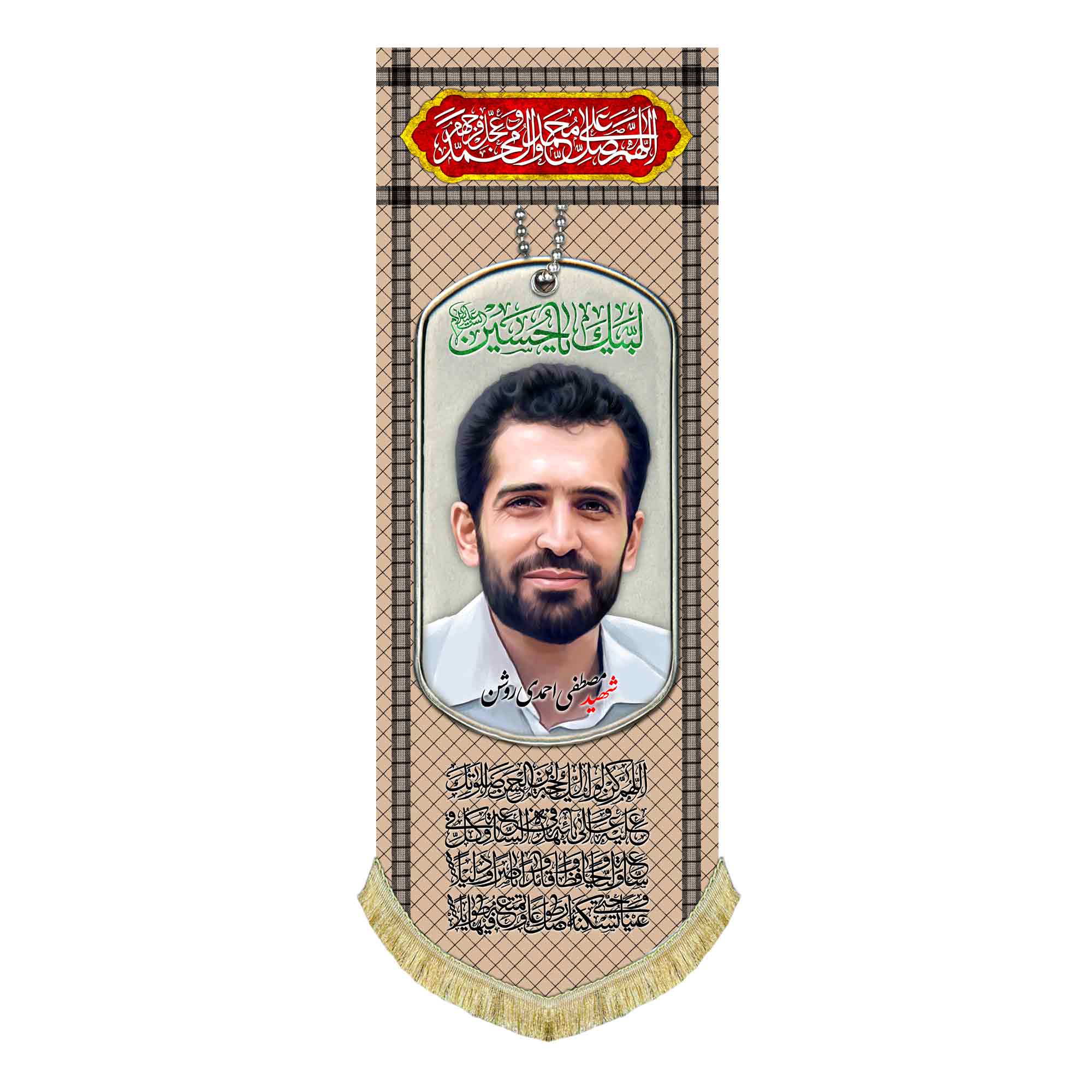 کتیبه ( پرچم ) مخمل شهید مصطفی احمدی روشن که با طراحی جدید چفیه رنگ خاکی و پلاک به همراه ذکر لبیک یا حسین (ع) ، اللهم صل علی محمد و آل محمد و عجل فرجهم و دعای سلامتی امام زمان (عج) در سایز عمودی قابل سفارش است. استفاده شده از پارچه مخمل درجه یک قابل شستشو و با بهترین کیفیت چاپ که همراه با دور دوزی ، ریشه دوزی و بندینک آویز می باشد. این محصول از طراحی تا چاپ به طور کامل در مجموعه انتشارات مشهور به تولید رسیده است.