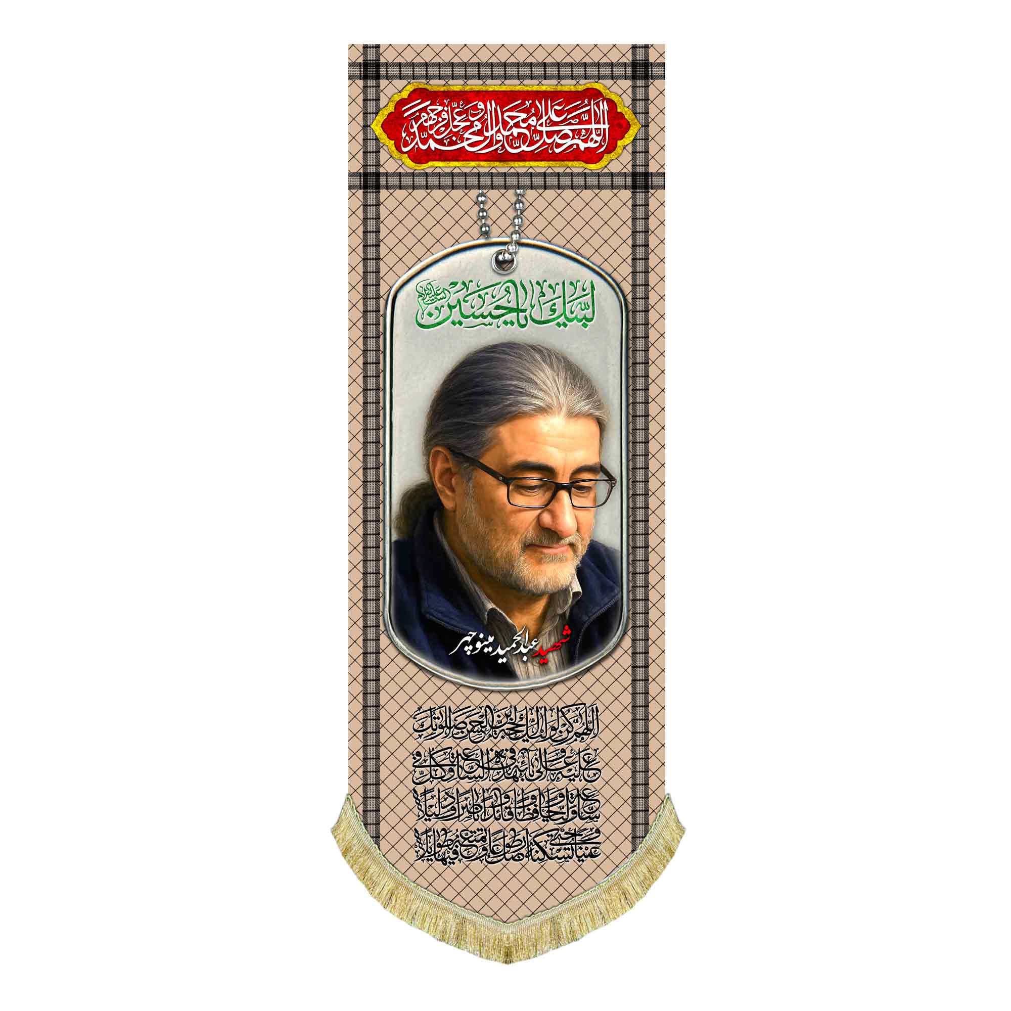 کتیبه ( پرچم ) مخمل شهید عبدالحمید مینوچهر که با طراحی جدید چفیه رنگ خاکی و پلاک به همراه ذکر لبیک یا حسین (ع) ، اللهم صل علی محمد و آل محمد و عجل فرجهم و دعای سلامتی امام زمان (عج) در سایز عمودی قابل سفارش است. استفاده شده از پارچه مخمل درجه یک قابل شستشو و با بهترین کیفیت چاپ که همراه با دور دوزی ، ریشه دوزی و بندینک آویز می باشد. این محصول از طراحی تا چاپ به طور کامل در مجموعه انتشارات مشهور به تولید رسیده است.