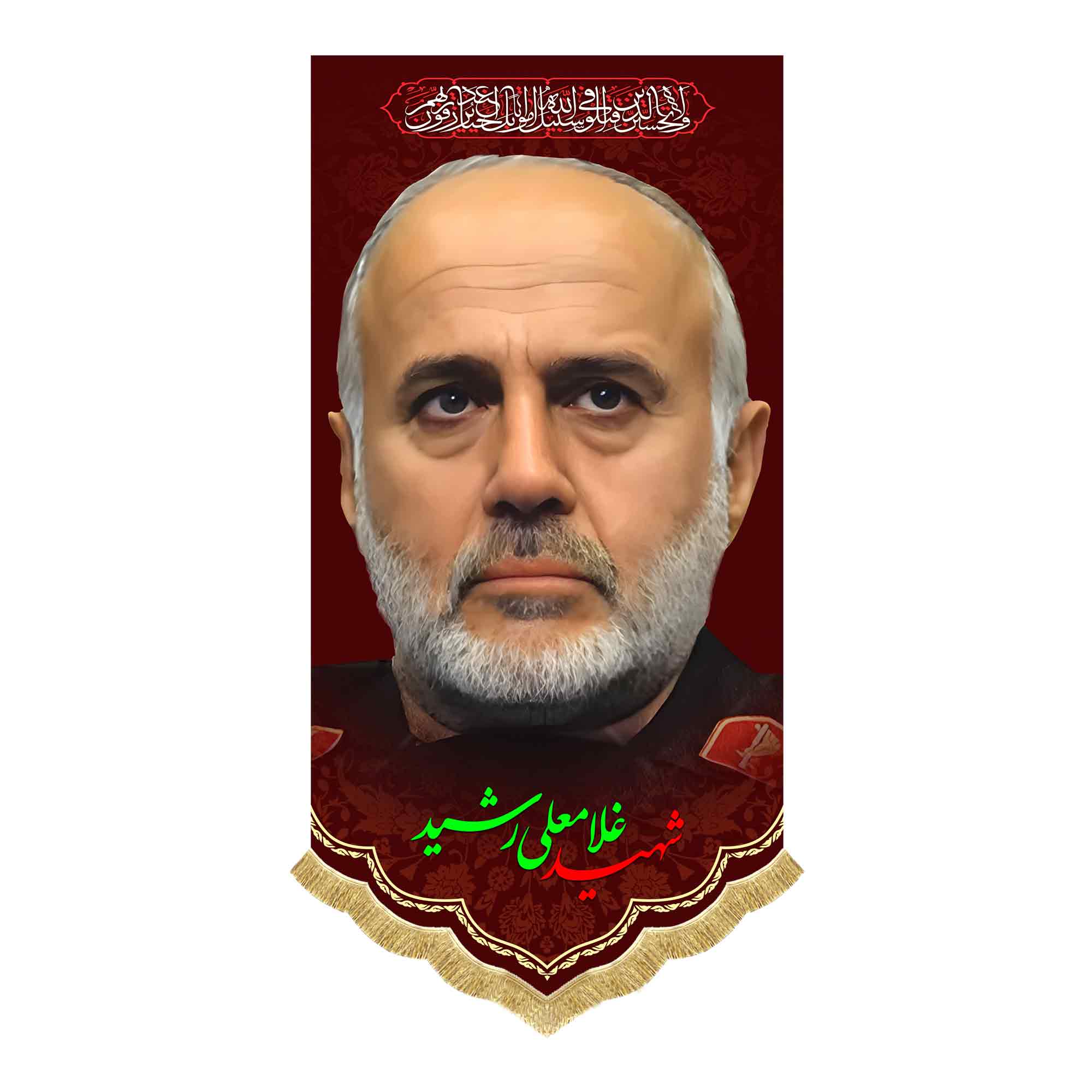 کتیبه ( پرچم ) مخمل شهید وطن غلامعلی رشید که با طراحی زیبا در ابعاد مختلف قابل سفارش است. استفاده شده از پارچه مخمل درجه یک قابل شستشو و با بهترین کیفیت چاپ که همراه با دور دوزی ، ریشه دوزی و بندینک آویز می باشد. این محصول از طراحی تا چاپ به طور کامل در مجموعه انتشارات مشهور به تولید رسیده است.