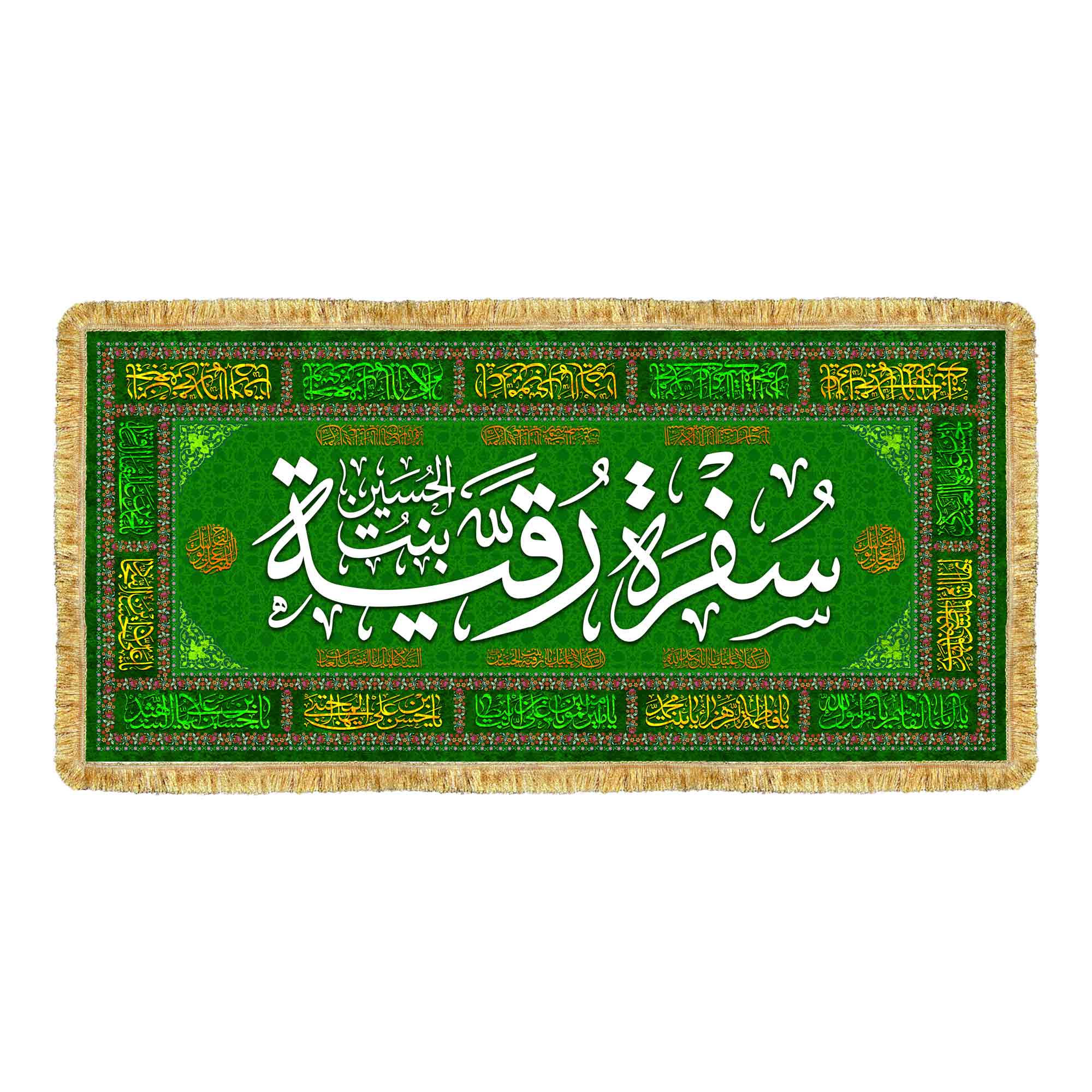 سفره مخمل حضرت رقیه (س) بنت الحسین (ع) به همراه اسامی مبارک چهارده معصوم (ع) ، دعای سلامتی امام زمان (عج) ، السلام علیک یا رقیه بنت الحسین (ع) که با طراحی جدید چهار طرفه در ابعاد مختلف قابل سفارش است. استفاده شده از پارچه مخمل درجه یک قابل شستشو با بهترین کیفیت چاپ که همراه با ریشه دوزی کامل دور ( چهار طرف ریشه ) می باشد. این محصول از طراحی تا چاپ به طور کامل در مجموعه انتشارات مشهور به تولید رسیده است.