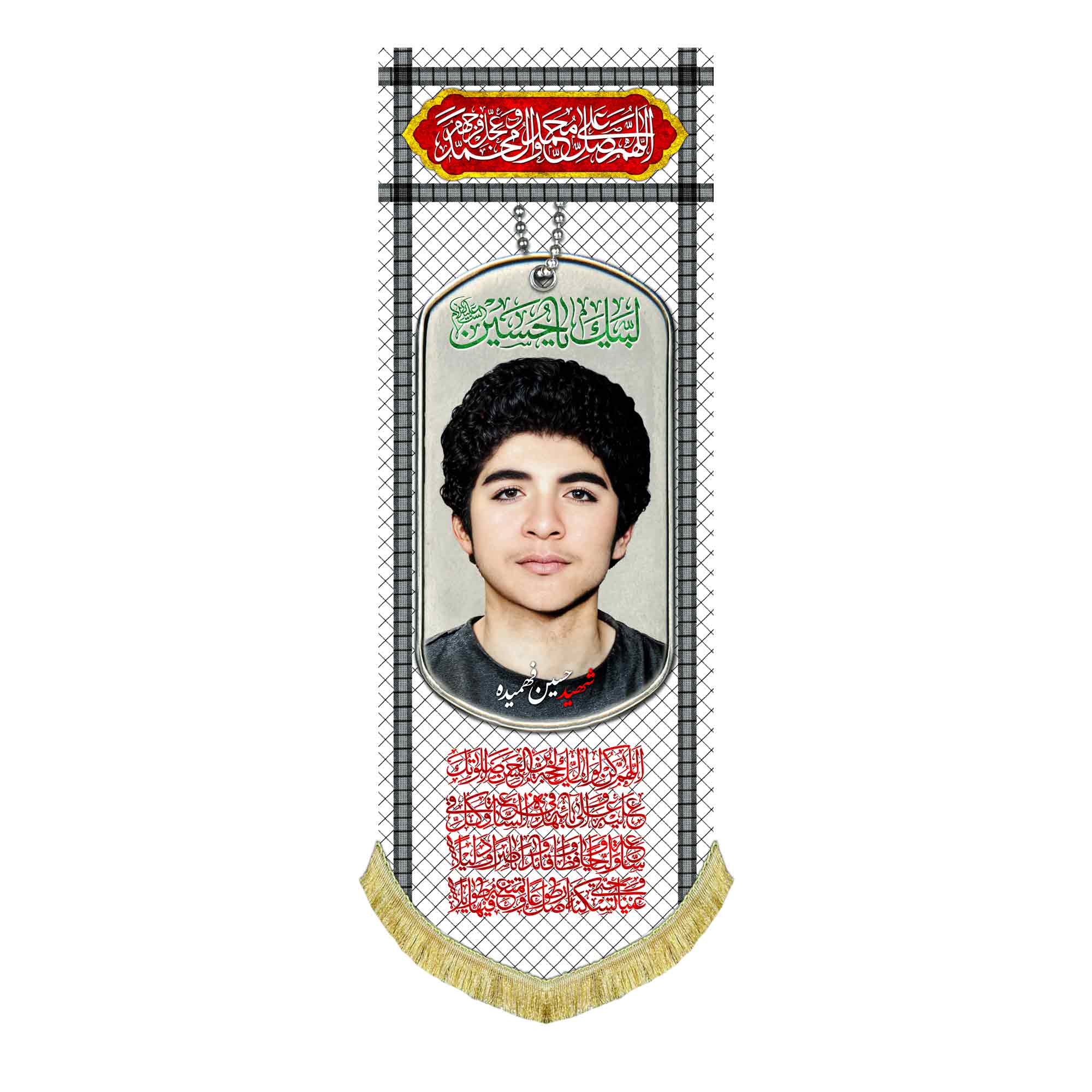 کتیبه ( پرچم ) مخمل شهید حسین فهمیده که با طراحی جدید چفیه و پلاک به همراه ذکر لبیک یا حسین (ع) ، اللهم صل علی محمد و آل محمد و عجل فرجهم و دعای سلامتی امام زمان (عج) در سایز عمودی قابل سفارش است. استفاده شده از پارچه مخمل درجه یک قابل شستشو و با بهترین کیفیت چاپ که همراه با دور دوزی ، ریشه دوزی و بندینک آویز می باشد. این محصول از طراحی تا چاپ به طور کامل در مجموعه انتشارات مشهور به تولید رسیده است.
