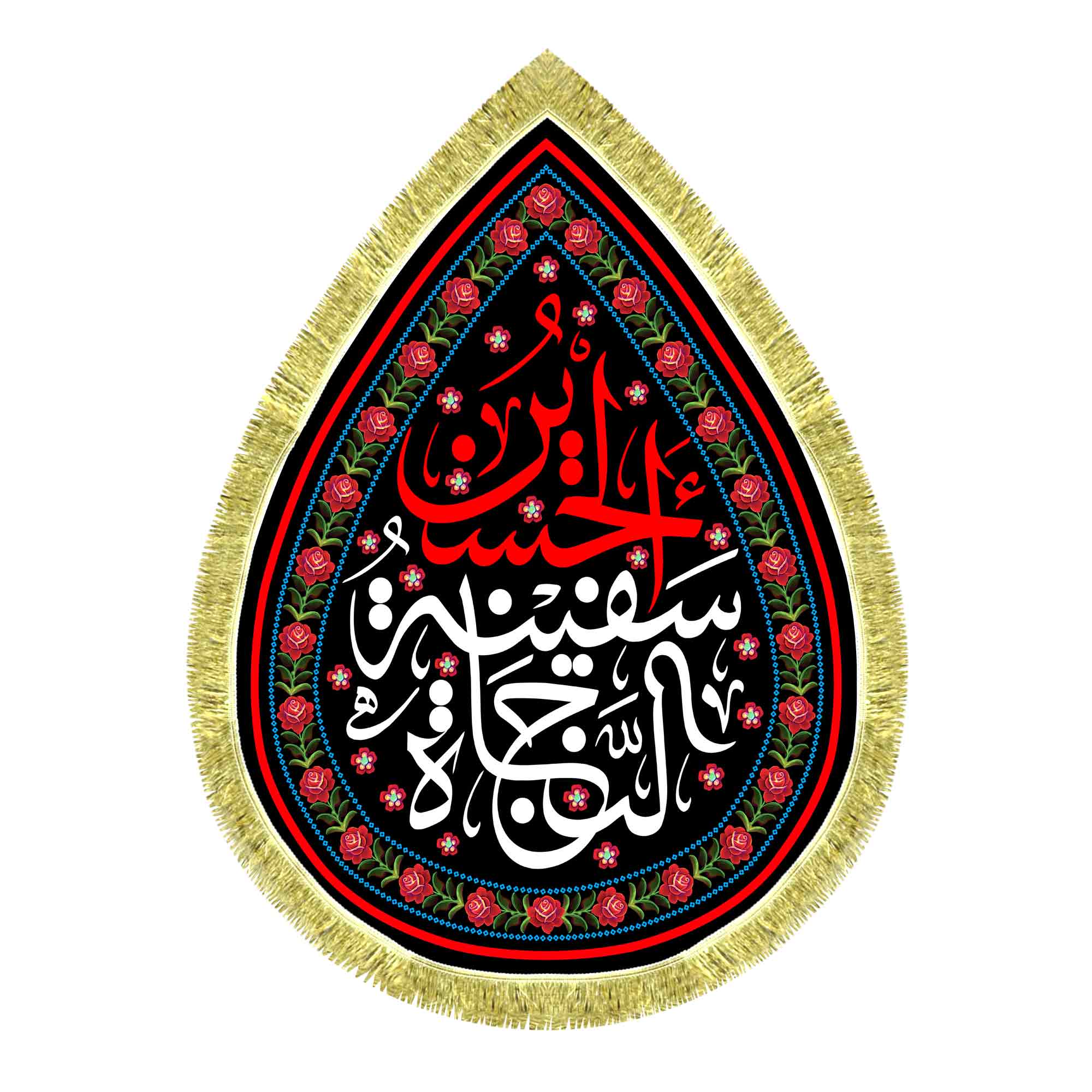 کتیبه مخمل طرح اشک ( قطره ای ) شهادت امام حسین (ع) با ذکر حسین سفینه النجاه که با طراحی جدید دور ریشه در ابعاد مختلف قابل سفارش است. استفاده شده از پارچه مخمل درجه یک قابل شستشو و با بهترین کیفیت چاپ که همراه با ریشه دوزی دور و بندینک آویز می باشد. این محصول از طراحی تا چاپ به طور کامل در انتشارات مشهور به تولید رسیده است.