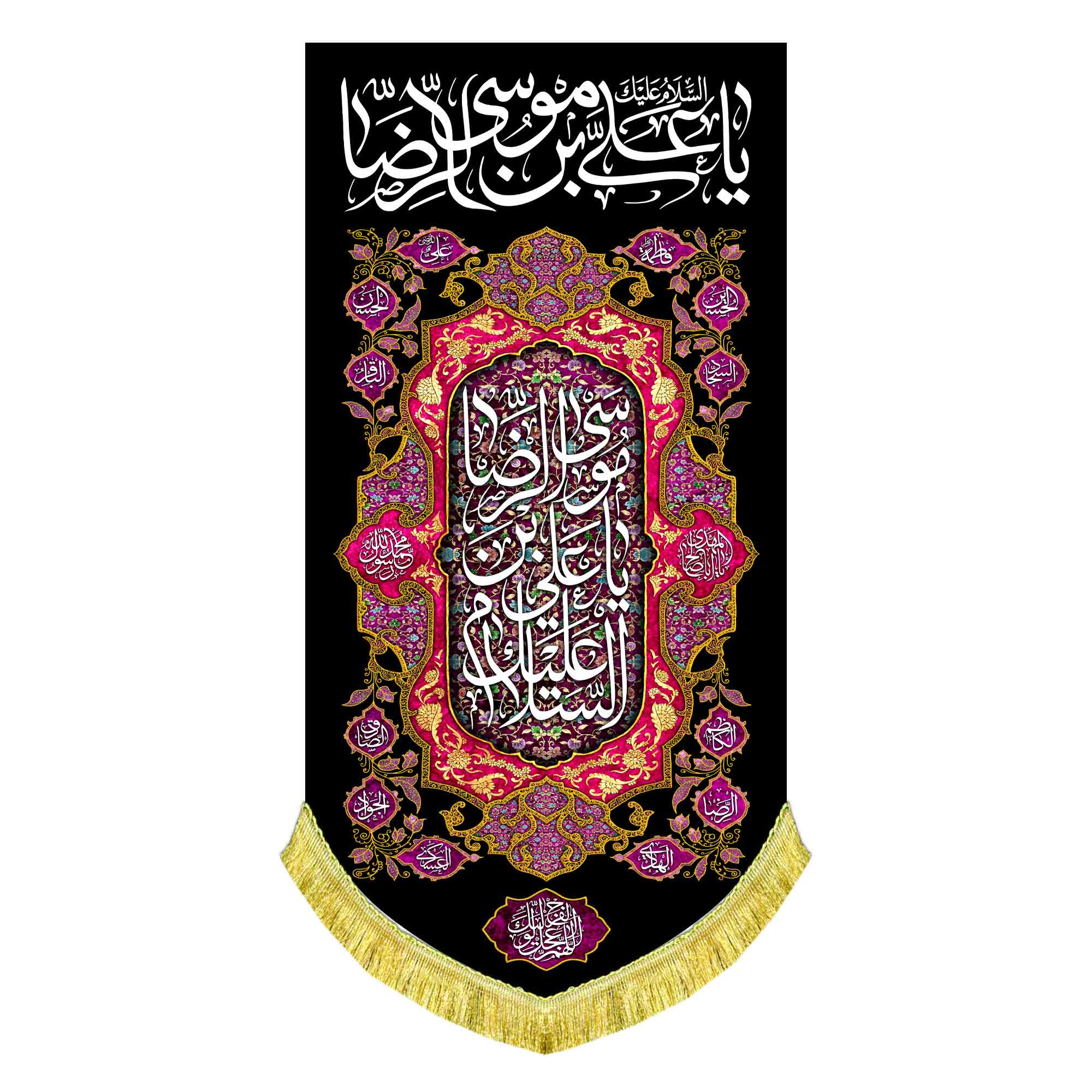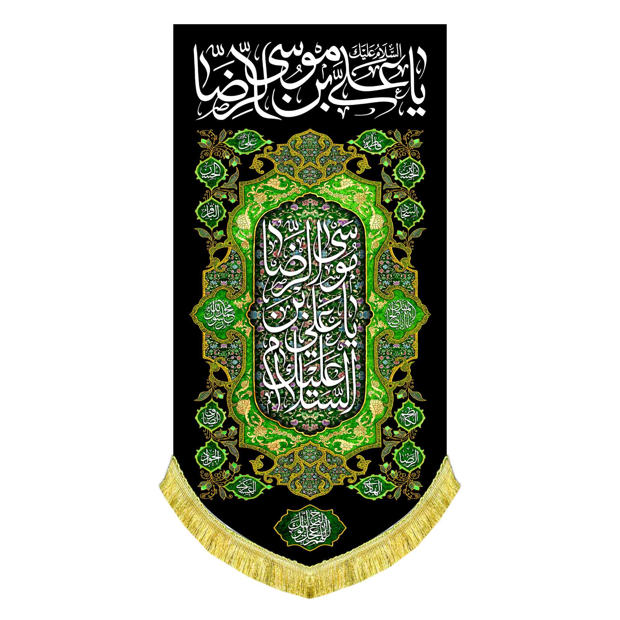 کتیبه ( پرچم ) مخمل صلوات خاصه امام رضا (ع) به همراه اسامی چهارده معصوم (ع) ، یا علی بن موسی الرضا (ع) ، اللهم عجل لولیک الفرج ، دعای سلامتی امام زمان (عج) که با طراحی جدید در ابعاد مختلف قابل سفارش است. استفاده شده از پارچه مخمل قابل شستشو با بهترین کیفیت چاپ و پارچه که همراه با دور دوزی ، ریشه دوزی و بندینک آویز می باشد. این محصول از طراحی تا چاپ به طور کامل در انتشارات مشهور به تولید رسیده است.