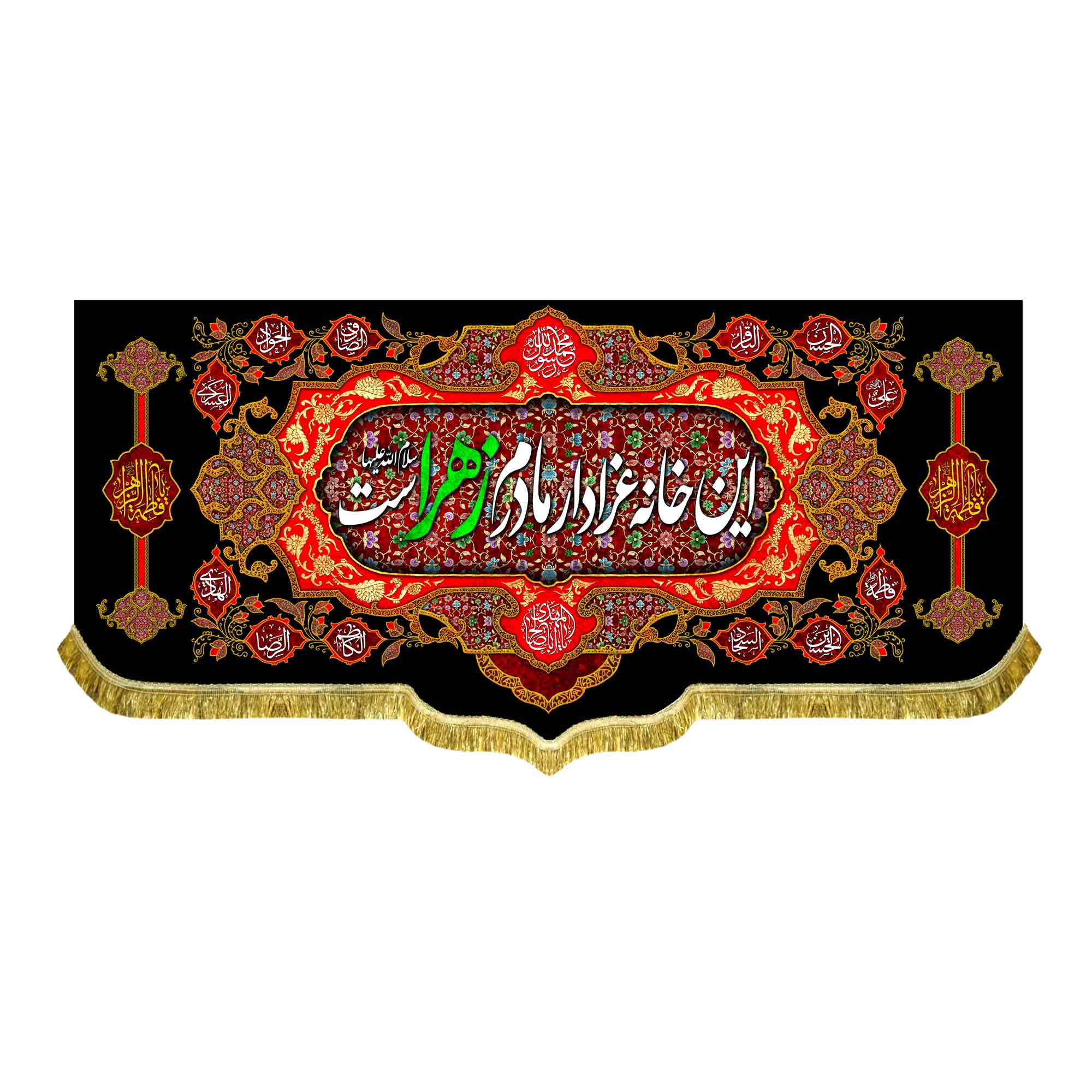 دکور ( کتیبه ) مخمل فاطمیه شهادت حضرت فاطمه زهرا (س) با ذکر این خانه عزادار مادرم زهراست به همراه اسامی مبارک چهارده معصوم (ع) ، السلام علیک یا فاطمه الزهرا (س) که با طراحی جدید مناسب مجالس عزاداری فاطمیه و شهادت حضرت زهرا (س) در ابعاد مختلف قابل سفارش است. استفاده شده از پارچه مخمل درجه یک قابل شستشو و با بهترین کیفیت چاپ که همراه با دور دوزی ، ریشه دوزی و بندینک آویز می باشد. این محصول از طراحی تا چاپ به طور کامل در انتشارات مشهور به تولید رسیده است.