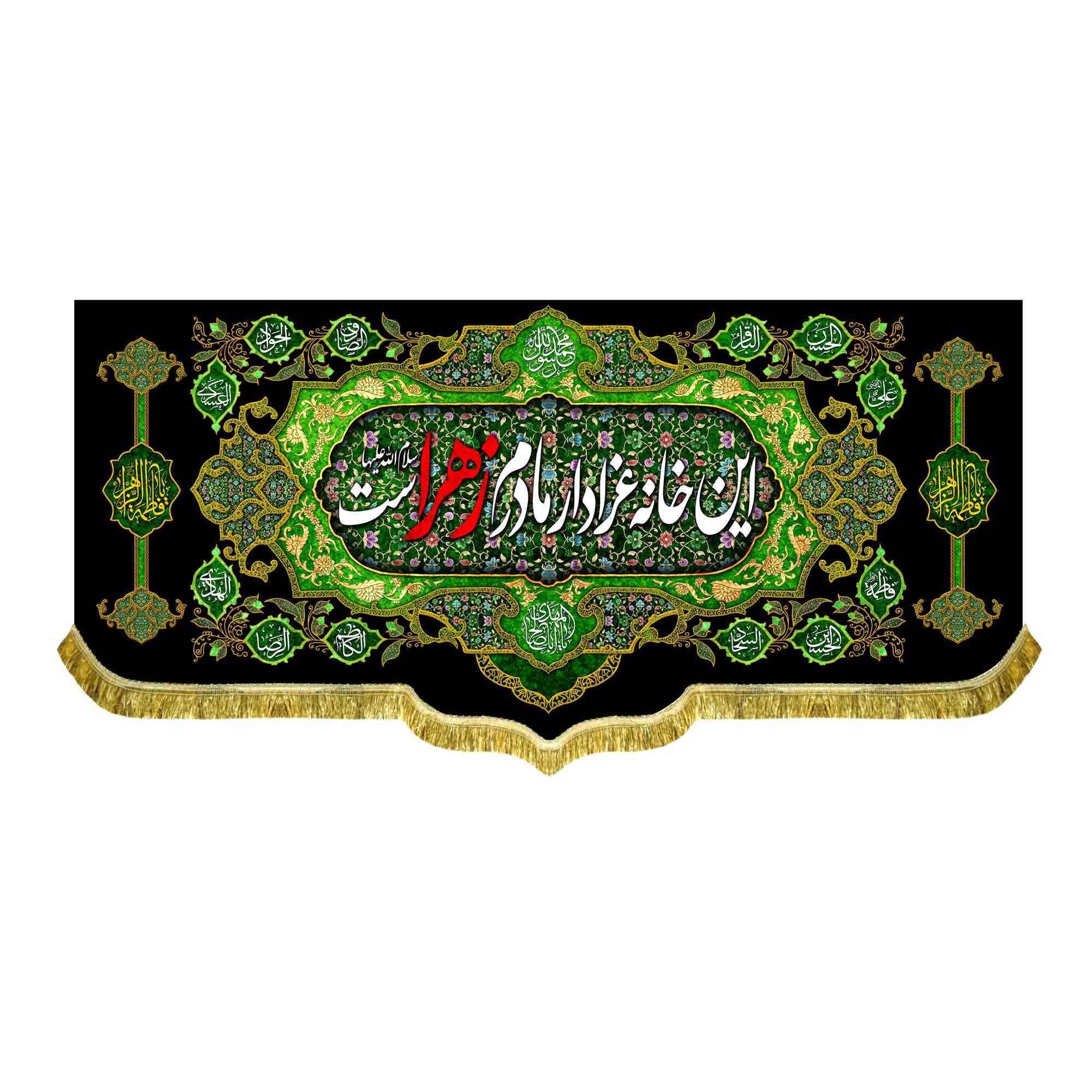 دکور ( کتیبه ) مخمل فاطمیه شهادت حضرت فاطمه زهرا (س) با ذکر این خانه عزادار مادرم زهراست به همراه اسامی مبارک چهارده معصوم (ع) ، السلام علیک یا فاطمه الزهرا (س) که با طراحی جدید مناسب مجالس عزاداری فاطمیه و شهادت حضرت زهرا (س) در ابعاد مختلف قابل سفارش است. استفاده شده از پارچه مخمل درجه یک قابل شستشو و با بهترین کیفیت چاپ که همراه با دور دوزی ، ریشه دوزی و بندینک آویز می باشد. این محصول از طراحی تا چاپ به طور کامل در انتشارات مشهور به تولید رسیده است.