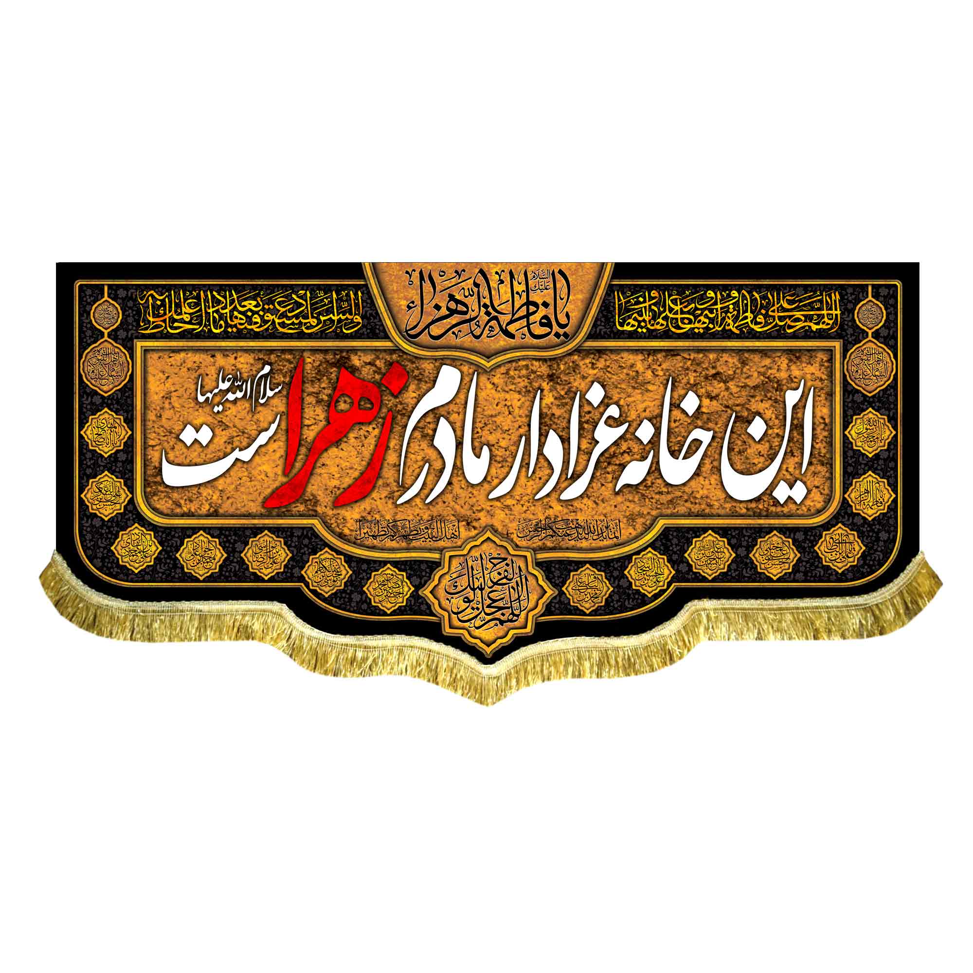 کتیبه ( پرچم ) مخمل فاطمیه شهادت حضرت فاطمه زهرا (س) با ذکر این خانه عزادار مادرم زهراست به همراه اسامی مبارک چهارده معصوم (ع) ، صلوات حضرت زهرا (س) ، اللهم عجل لولیک الفرج ، السلام علیک یا فاطمه الزهرا (س) که با طراحی جدید مناسب مجالس عزاداری فاطمیه و شهادت حضرت زهرا (س) در ابعاد مختلف قابل سفارش است. استفاده شده از پارچه مخمل درجه یک قابل شستشو و با بهترین کیفیت چاپ که همراه با دور دوزی ، ریشه دوزی و بندینک آویز می باشد. این محصول از طراحی تا چاپ به طور کامل در انتشارات مشهور به تولید رسیده است.