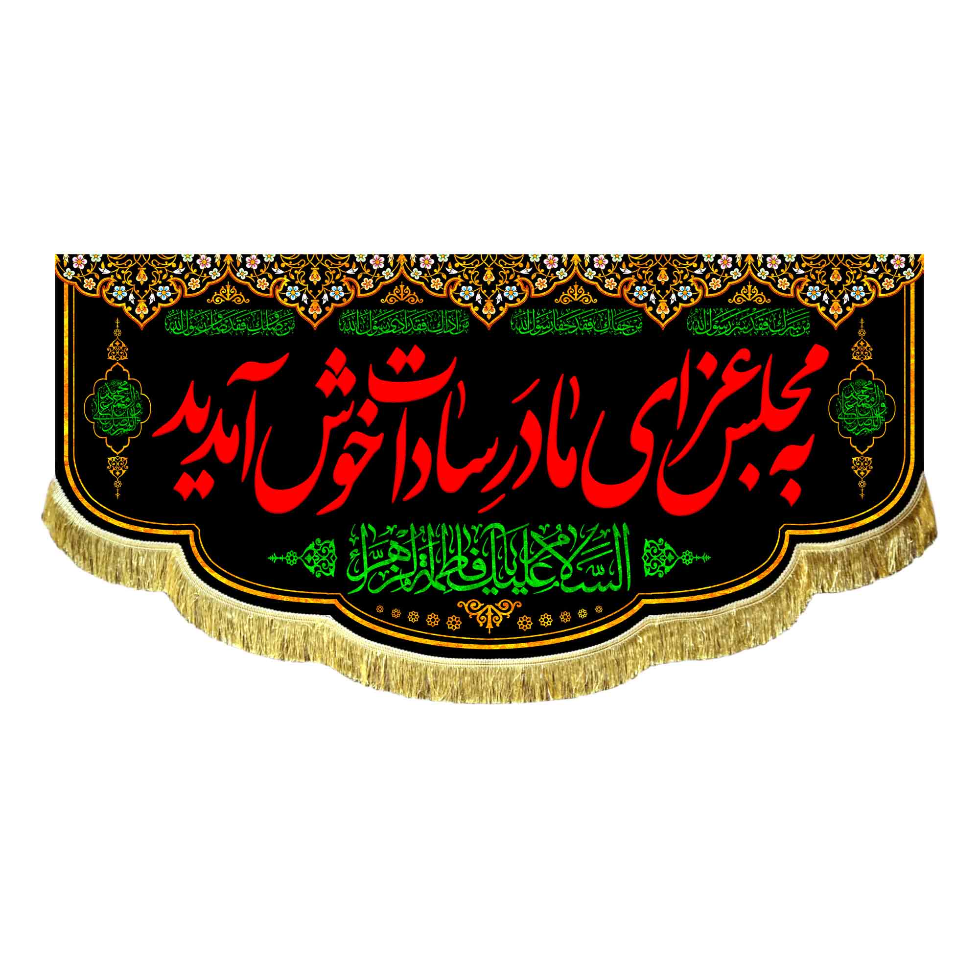 کتیبه ( پرچم ) مخمل سردری شهادت حضرت فاطمه زهرا (س) به مجلس عزای مادر سادات خوش آمدید به همراه صلوات ، السلام علیک یا فاطمه الزهرا (س) که با طراحی جدید مناسب مجالس عزاداری فاطمیه و شهادت حضرت زهرا (س) در ابعاد مختلف قابل سفارش است. استفاده شده از پارچه مخمل درجه یک قابل شستشو و با بهترین کیفیت چاپ که همراه با دور دوزی ، ریشه دوزی و بندینک آویز می باشد. این محصول از طراحی تا چاپ به طور کامل در انتشارات مشهور به تولید رسیده است.