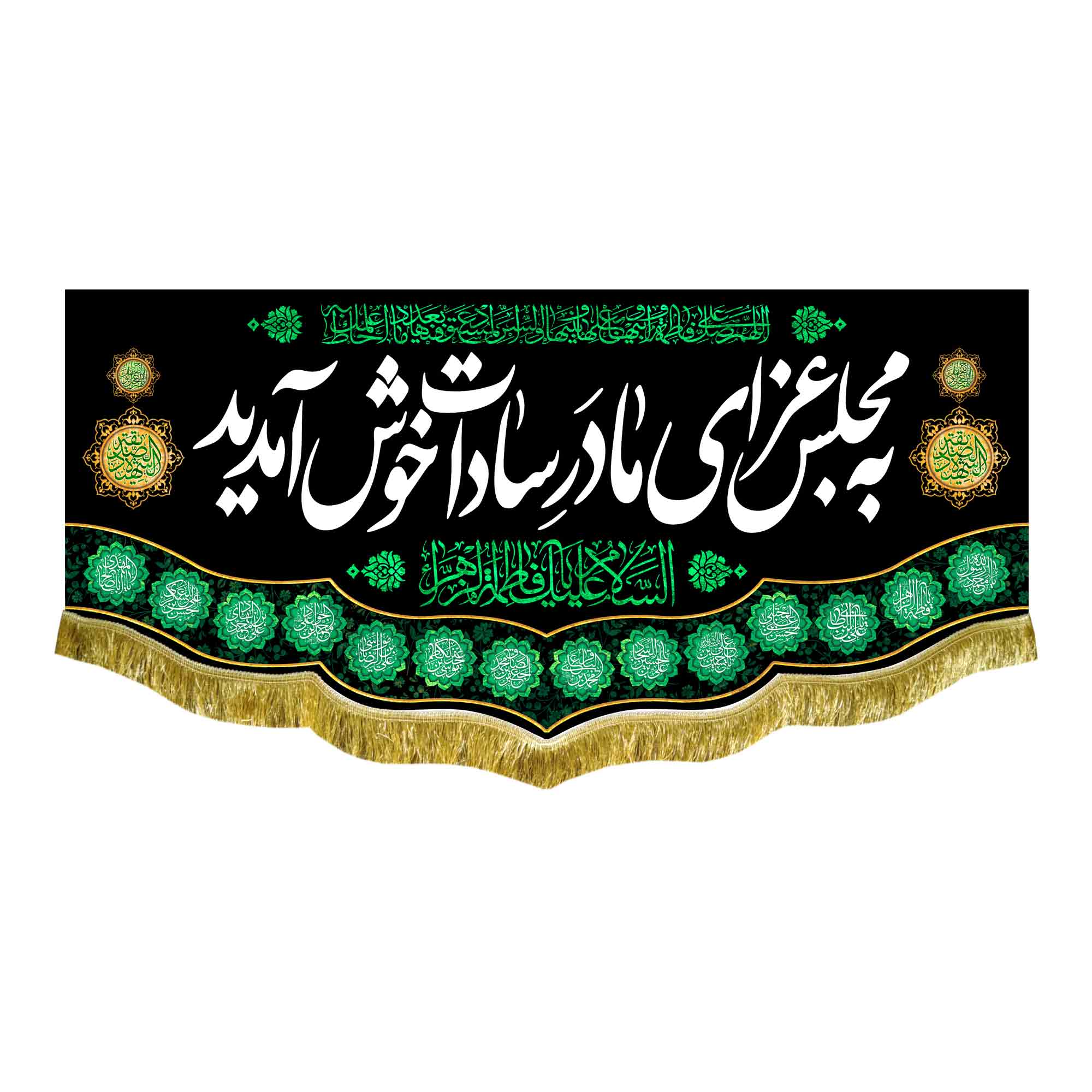 کتیبه ( پرچم ) مخمل شهادت حضرت فاطمه زهرا (س) به مجلس عزای مادر سادات خوش آمدید به همراه اسامی مبارک چهارده معصوم (ع) ، صلوات حضرت زهرا (س) ، السلام علیک یا فاطمه الزهرا (س) که با طراحی جدید مناسب مجالس عزاداری فاطمیه و شهادت حضرت زهرا (س) در ابعاد مختلف قابل سفارش است. استفاده شده از پارچه مخمل درجه یک قابل شستشو و با بهترین کیفیت چاپ که همراه با دور دوزی ، ریشه دوزی و بندینک آویز می باشد. این محصول از طراحی تا چاپ به طور کامل در انتشارات مشهور به تولید رسیده است.