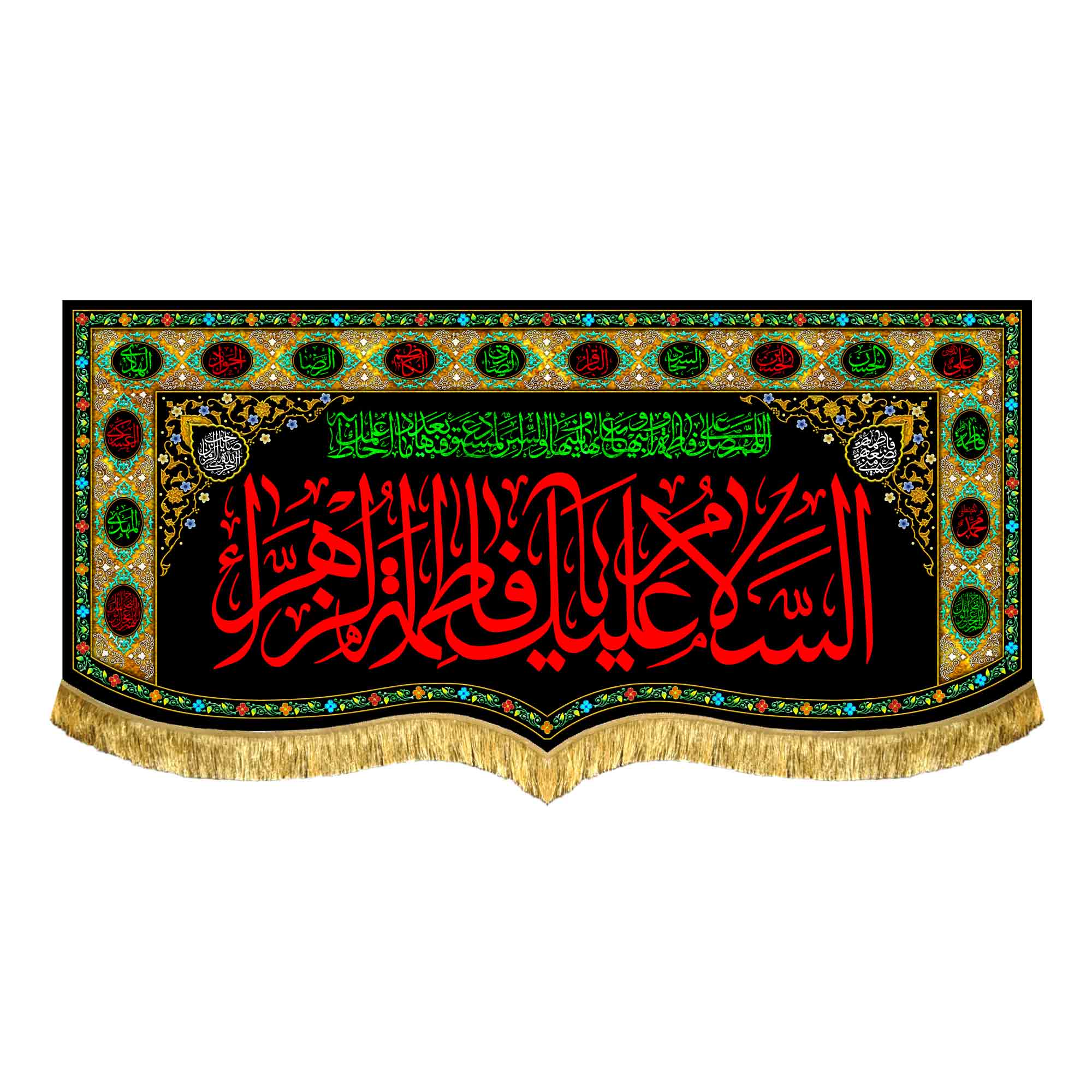 کتیبه ( دکور ) مخمل طرح سبک گلدوزی فاطمیه شهادت حضرت فاطمه زهرا (س) با ذکر السلام علیک یا فاطمه الزهرا (س) به همراه اسامی مبارک چهارده معصوم (ع) ، صلوات حضرت زهرا (س) ، اللهم عجل لولیک الفرج ، آجرک الله یا صاحب الزمان (عج) که با طراحی جدید دالبر مناسب مجالس عزاداری فاطمیه و شهادت حضرت زهرا (س) در ابعاد مختلف قابل سفارش است. استفاده شده از پارچه مخمل درجه یک قابل شستشو و با بهترین کیفیت چاپ که همراه با دور دوزی ، ریشه دوزی و بندینک آویز می باشد. این محصول از طراحی تا چاپ به طور کامل در انتشارات مشهور به تولید رسیده است.