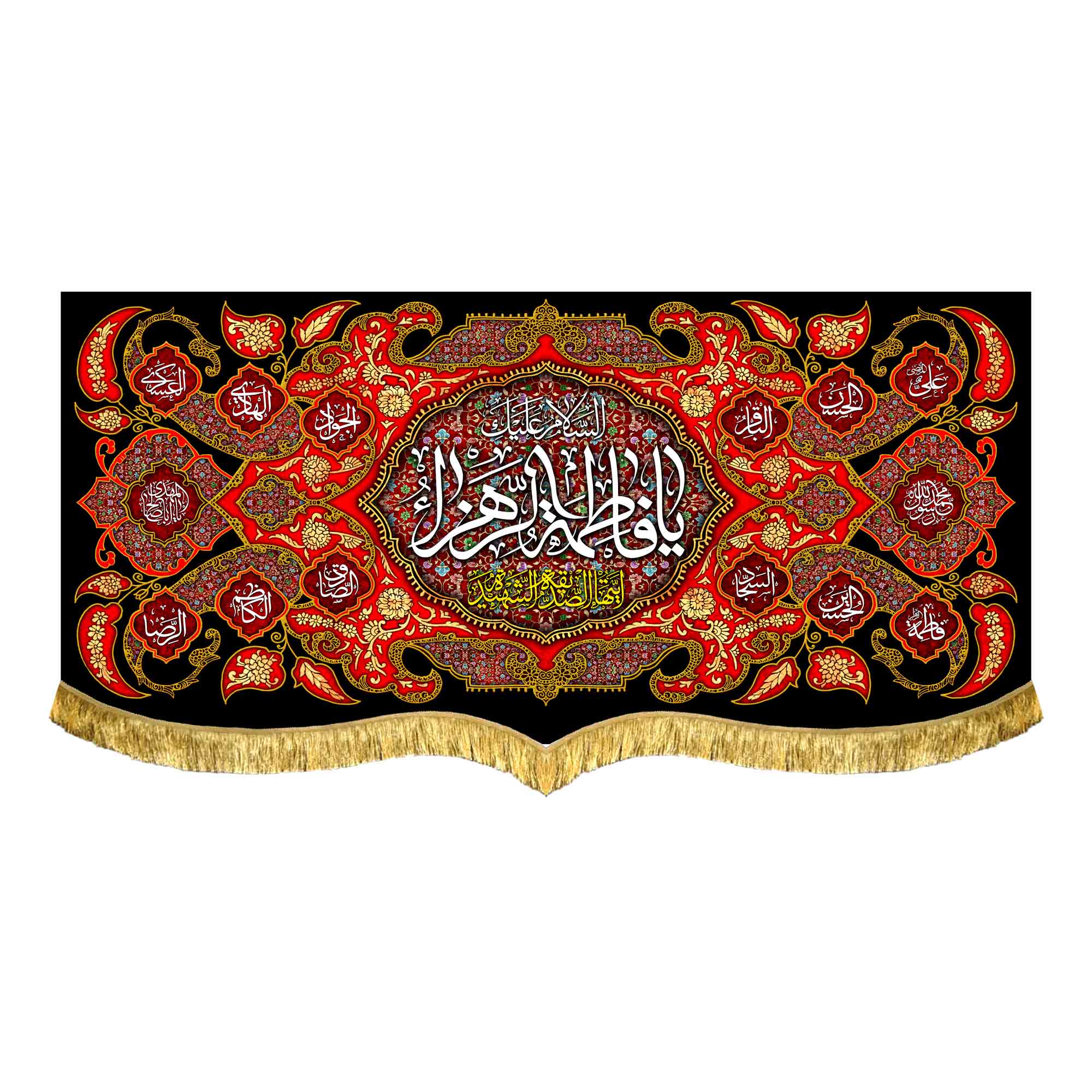 دکور پشت منبری مخمل فاطمیه شهادت حضرت فاطمه زهرا (س) با ذکر السلام علیک یا فاطمه الزهرا (س) به همراه اسامی مبارک چهارده معصوم (ع) ، ایتها الصدیقه الشهیده که با طراحی جدید مناسب مجالس عزاداری فاطمیه و شهادت حضرت زهرا (س) در ابعاد مختلف قابل سفارش است. استفاده شده از پارچه مخمل درجه یک قابل شستشو و با بهترین کیفیت چاپ که همراه با دور دوزی ، ریشه دوزی و بندینک آویز می باشد. این محصول از طراحی تا چاپ به طور کامل در انتشارات مشهور به تولید رسیده است.