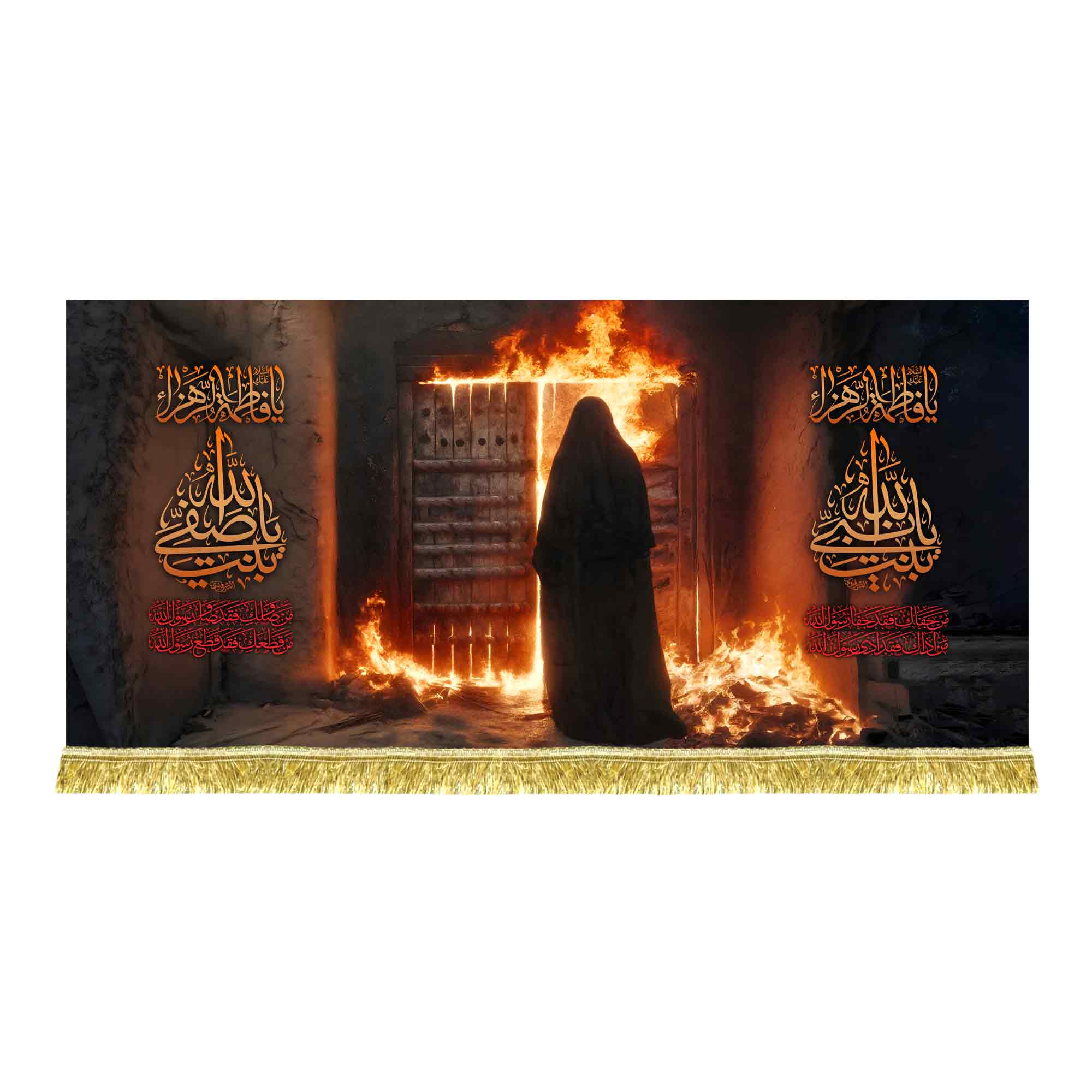 کتیبه ( دکور ) مخمل فاطمیه حضرت زهرا (س) و درب سوخته به همراه ذکر السلام علیک یا فاطمه الزهرا (س) که با طراحی جدید مناسب مجالس عزاداری فاطمیه و شهادت حضرت زهرا (س) در ابعاد مختلف قابل سفارش است. استفاده شده از پارچه مخمل درجه یک قابل شستشو و با بهترین کیفیت چاپ که همراه با دور دوزی ، ریشه دوزی و بندینک آویز می باشد. این محصول از طراحی تا چاپ به طور کامل در انتشارات مشهور به تولید رسیده است.
