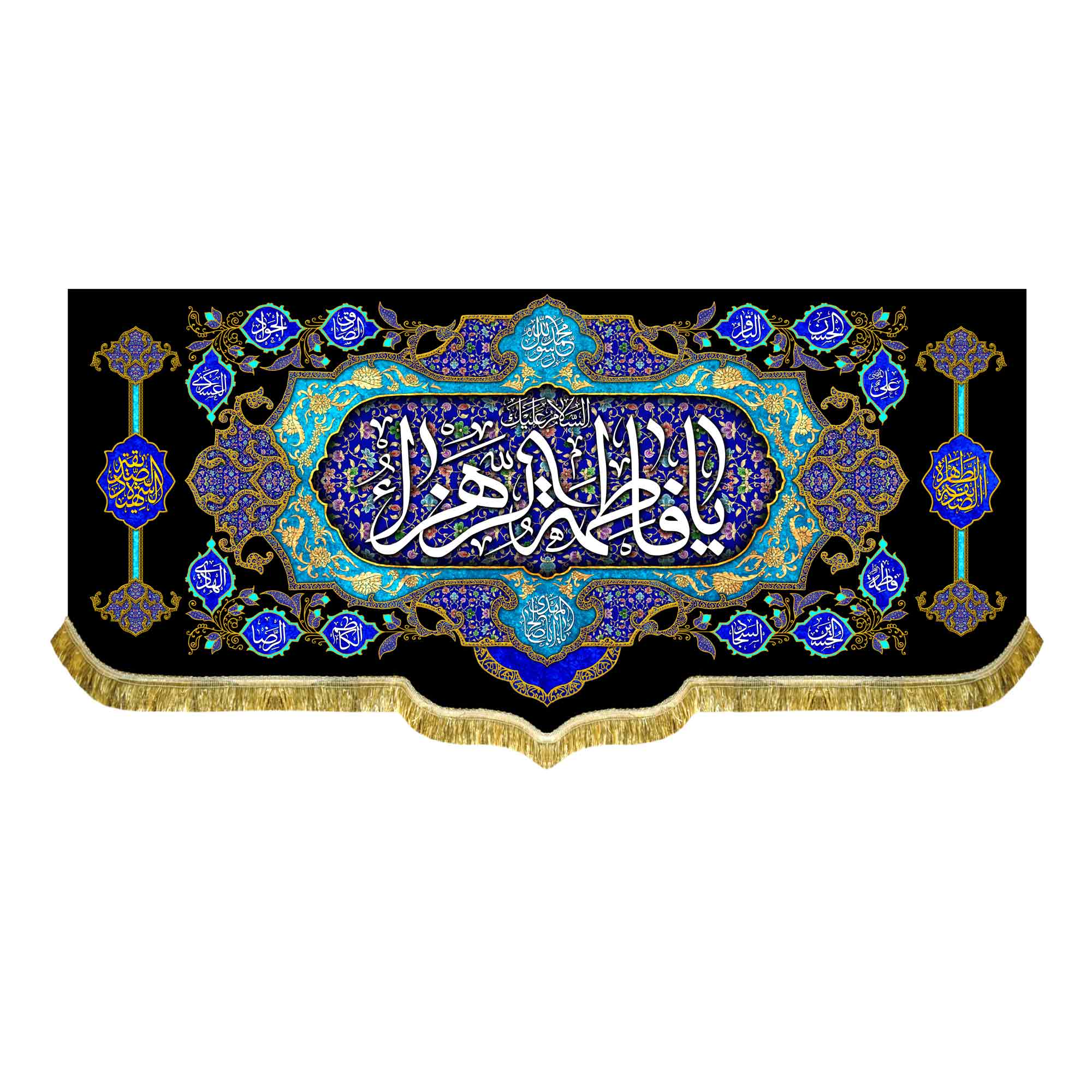 کتیبه ( دکور ) مخمل ایام فاطمیه شهادت حضرت فاطمه زهرا (س) با ذکر السلام علیک یا فاطمه الزهرا (س) ، صدیقه طاهره ، صدیقه شهیده که با طراحی جدید مناسب مجالس عزاداری فاطمیه و شهادت حضرت زهرا (س) در ابعاد مختلف قابل سفارش است. استفاده شده از پارچه مخمل درجه یک قابل شستشو و با بهترین کیفیت چاپ که همراه با دور دوزی ، ریشه دوزی و بندینک آویز می باشد. این محصول از طراحی تا چاپ به طور کامل در انتشارات مشهور به تولید رسیده است.