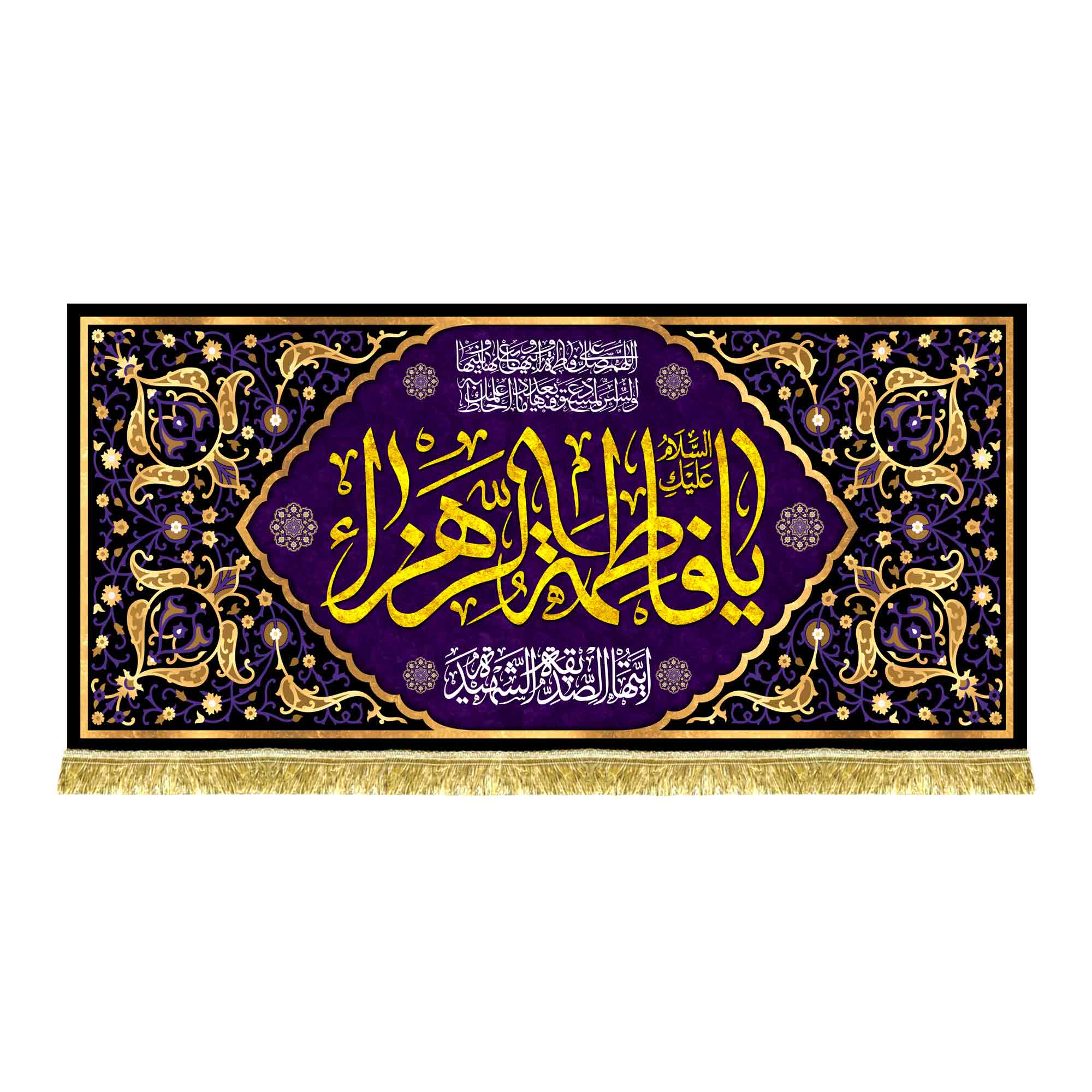 کتیبه ( دکور ) مخمل فاطمیه شهادت حضرت فاطمه زهرا (س) با ذکر السلام علیک یا فاطمه الزهرا (س) به همراه صلوات حضرت زهرا (س) ، ایتها الصدیقه الشهیده که با طراحی جدید مناسب مجالس عزاداری فاطمیه و شهادت حضرت زهرا (س) در ابعاد مختلف قابل سفارش است. استفاده شده از پارچه مخمل درجه یک قابل شستشو و با بهترین کیفیت چاپ که همراه با دور دوزی ، ریشه دوزی و بندینک آویز می باشد. این محصول از طراحی تا چاپ به طور کامل در انتشارات مشهور به تولید رسیده است.