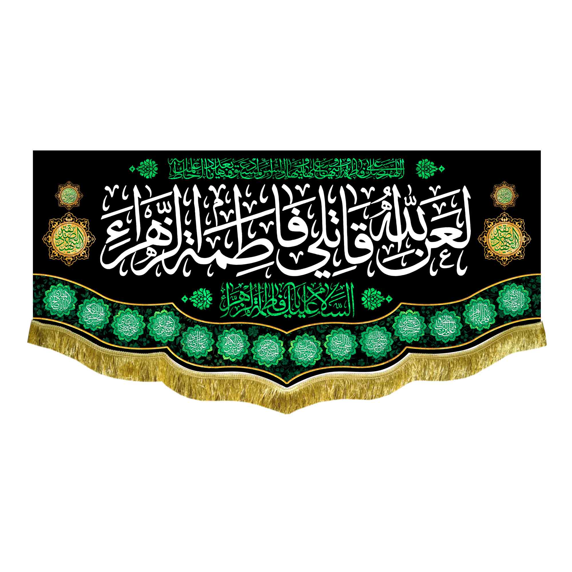 کتیبه ( دکور ) مخمل فاطمیه شهادت حضرت فاطمه زهرا (س) لعن الله قاتلی فاطمه الزهرا (س) به همراه اسامی مبارک چهارده معصوم (ع) ، صلوات حضرت زهرا (س) ، السلام علیک یا فاطمه الزهرا (س) که با طراحی جدید در ابعاد مختلف قابل سفارش است. استفاده شده از پارچه مخمل درجه یک قابل شستشو و با بهترین کیفیت چاپ که همراه با دور دوزی ، ریشه دوزی و بندینک آویز می باشد. این محصول از طراحی تا چاپ به طور کامل در انتشارات مشهور به تولید رسیده است.