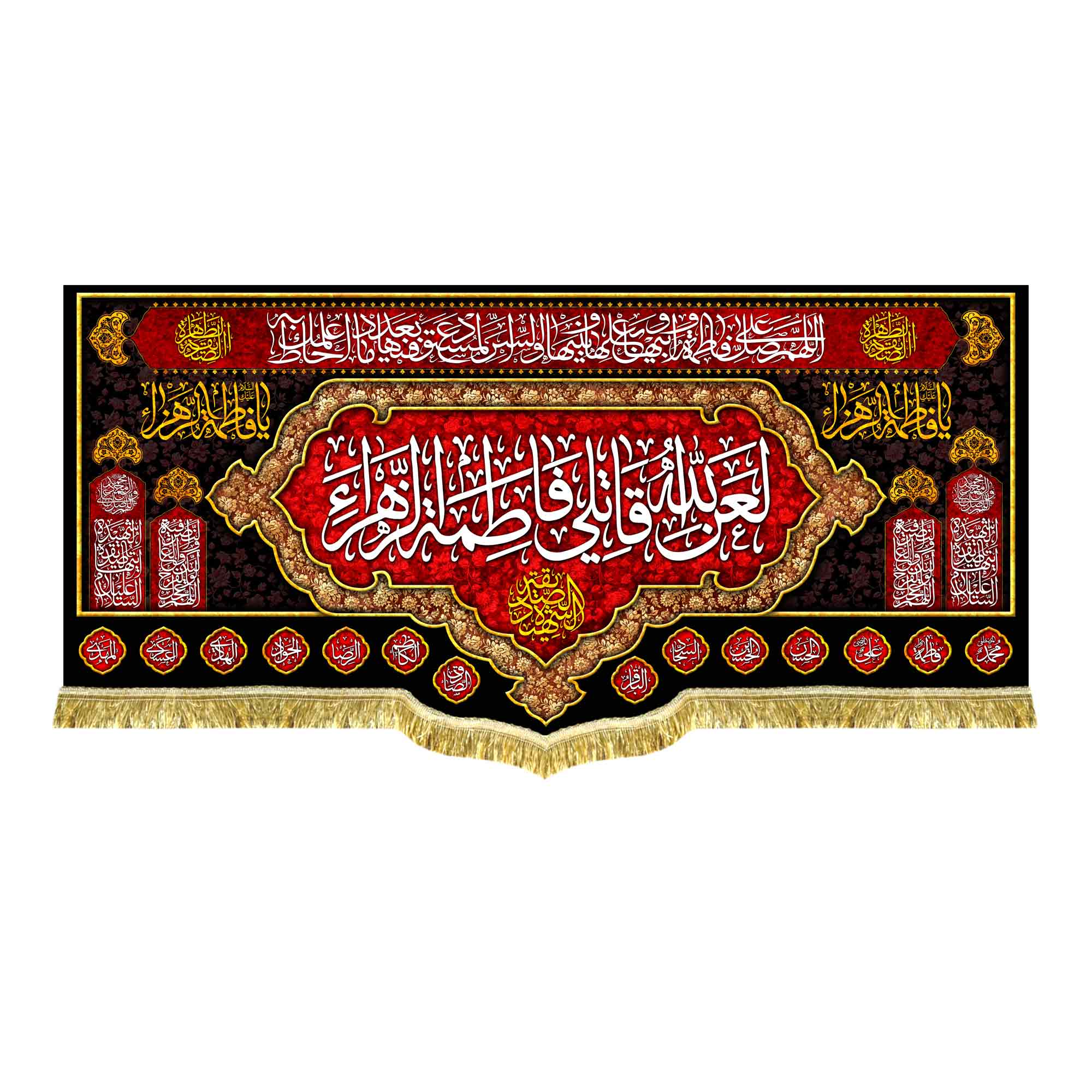 دکور ( کتیبه ) مخمل فاطمیه شهادت حضرت فاطمه زهرا (س) لعن الله قاتلی فاطمه زهرا (س) به همراه اسامی مبارک چهارده معصوم (ع) ، صلوات حضرت زهرا (س) ، السلام علیک یا فاطمه الزهرا (س) ، اللهم عجل لولیک الفرج ، السلام علیک ایتها الصدیقه الشهیده که با طراحی جدید در ابعاد مختلف قابل سفارش است. استفاده شده از پارچه مخمل درجه یک قابل شستشو و با بهترین کیفیت چاپ که همراه با دور دوزی ، ریشه دوزی و بندینک آویز می باشد. این محصول از طراحی تا چاپ به طور کامل در انتشارات مشهور به تولید رسیده است.