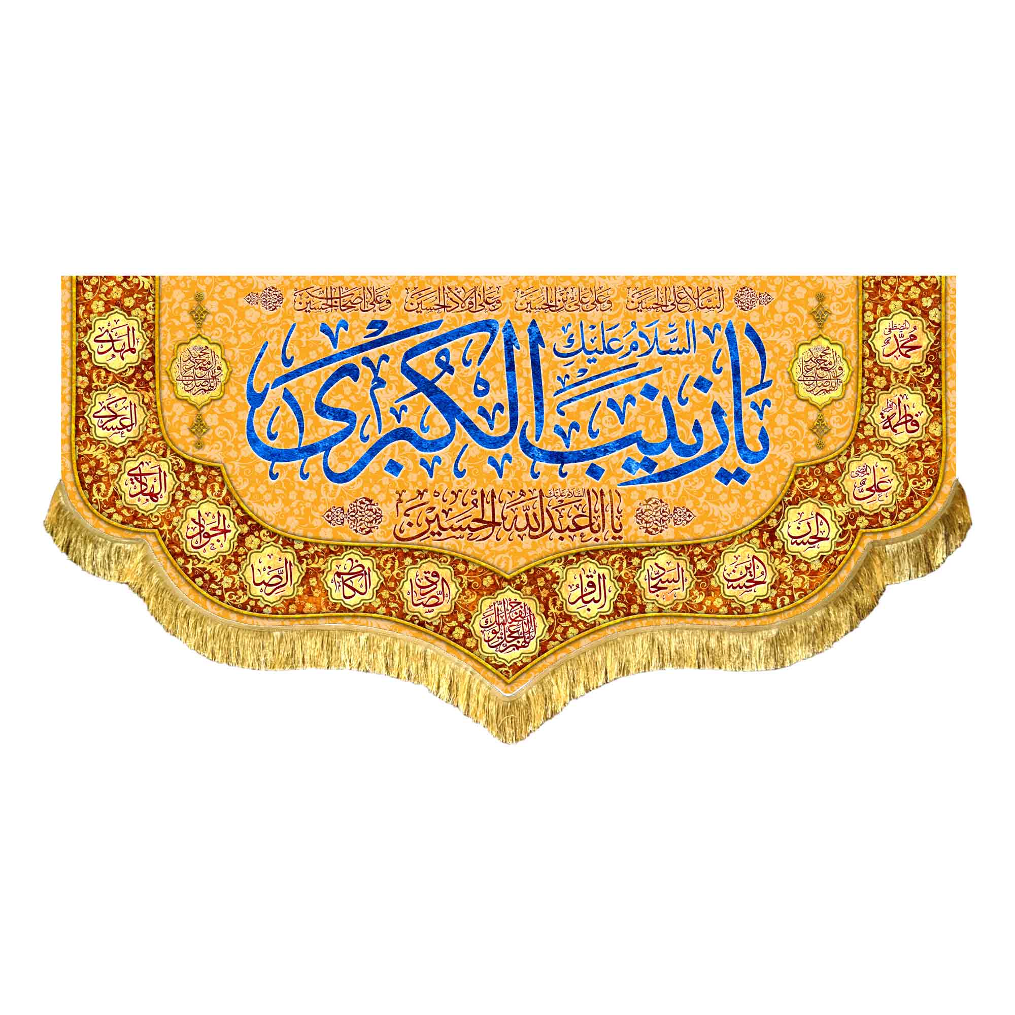 دکور ( کتیبه ) مخمل ولادت حضرت زینب (س) با ذکر السلام علیک یا زینب کبری (س) به همراه اسامی مبارک چهارده معصوم (ع) ، السلام علیک یا اباعبدالله الحسین (ع) ، اللهم عجل لولیک الفرج ، صلوات ، چهار سلام زیارت عاشورا که با طراحی جدید در ابعاد مختلف قابل سفارش است. استفاده شده از پارچه مخمل درجه یک قابل شستشو و با بهترین کیفیت چاپ که همراه با دور دوزی ، ریشه دوزی و بندینک آویز می باشد. این محصول از طراحی تا چاپ به طور کامل در انتشارات مشهور به تولید رسیده است.