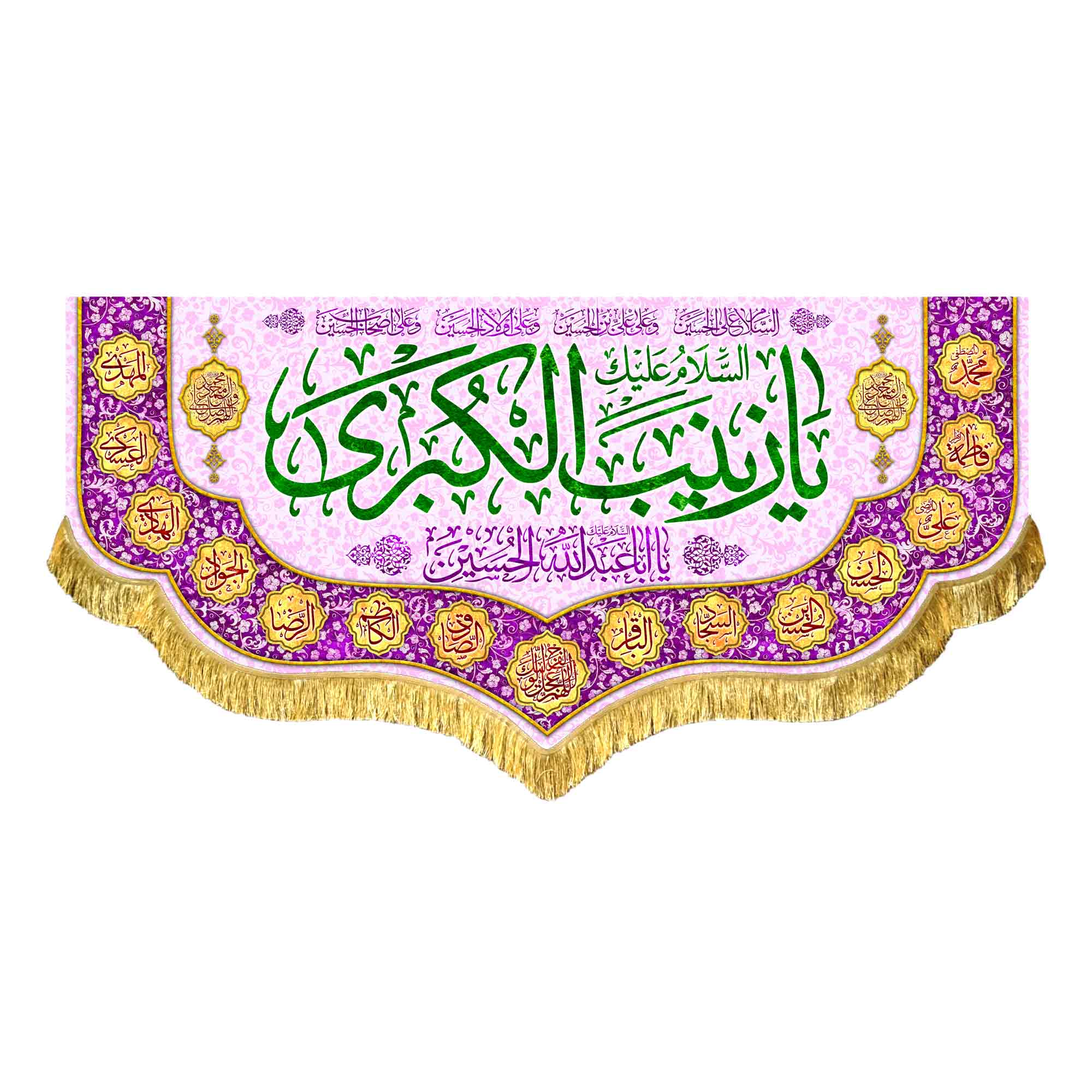 دکور ( کتیبه ) مخمل ولادت حضرت زینب (س) با ذکر السلام علیک یا زینب کبری (س) به همراه اسامی مبارک چهارده معصوم (ع) ، السلام علیک یا اباعبدالله الحسین (ع) ، اللهم عجل لولیک الفرج ، صلوات ، چهار سلام زیارت عاشورا که با طراحی جدید در ابعاد مختلف قابل سفارش است. استفاده شده از پارچه مخمل درجه یک قابل شستشو و با بهترین کیفیت چاپ که همراه با دور دوزی ، ریشه دوزی و بندینک آویز می باشد. این محصول از طراحی تا چاپ به طور کامل در انتشارات مشهور به تولید رسیده است.