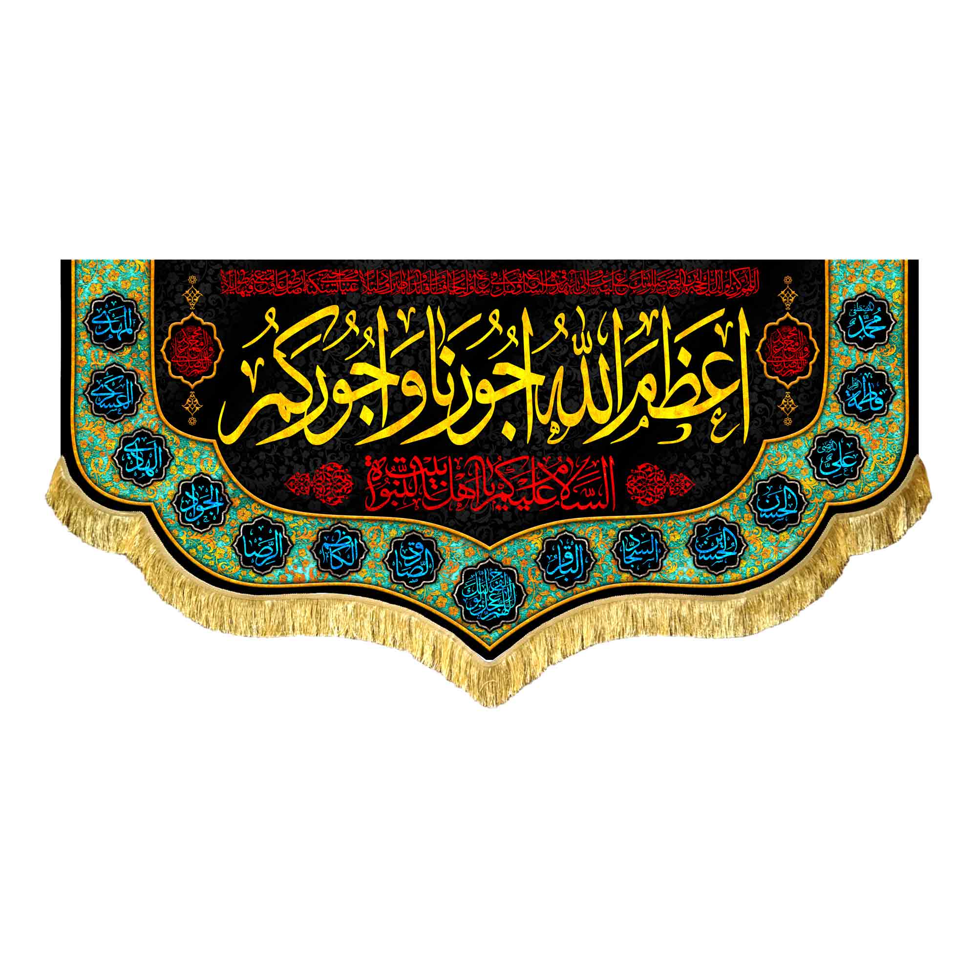 کتیبه ( دکور ) مخمل اعظم الله اجورنا و اجورکم به همراه اسامی مبارک چهارده معصوم (ع) ، السلام علیکم یا اهل بیت النبوه ، اللهم عجل لولیک الفرج ، صلوات ، دعای سلامتی امام زمان (عج) که با طراحی جدید در ابعاد مختلف قابل سفارش است. استفاده شده از پارچه مخمل درجه یک قابل شستشو و با بهترین کیفیت چاپ که همراه با دور دوزی ، ریشه دوزی و بندینک آویز می باشد. این محصول از طراحی تا چاپ به طور کامل در انتشارات مشهور به تولید رسیده است.