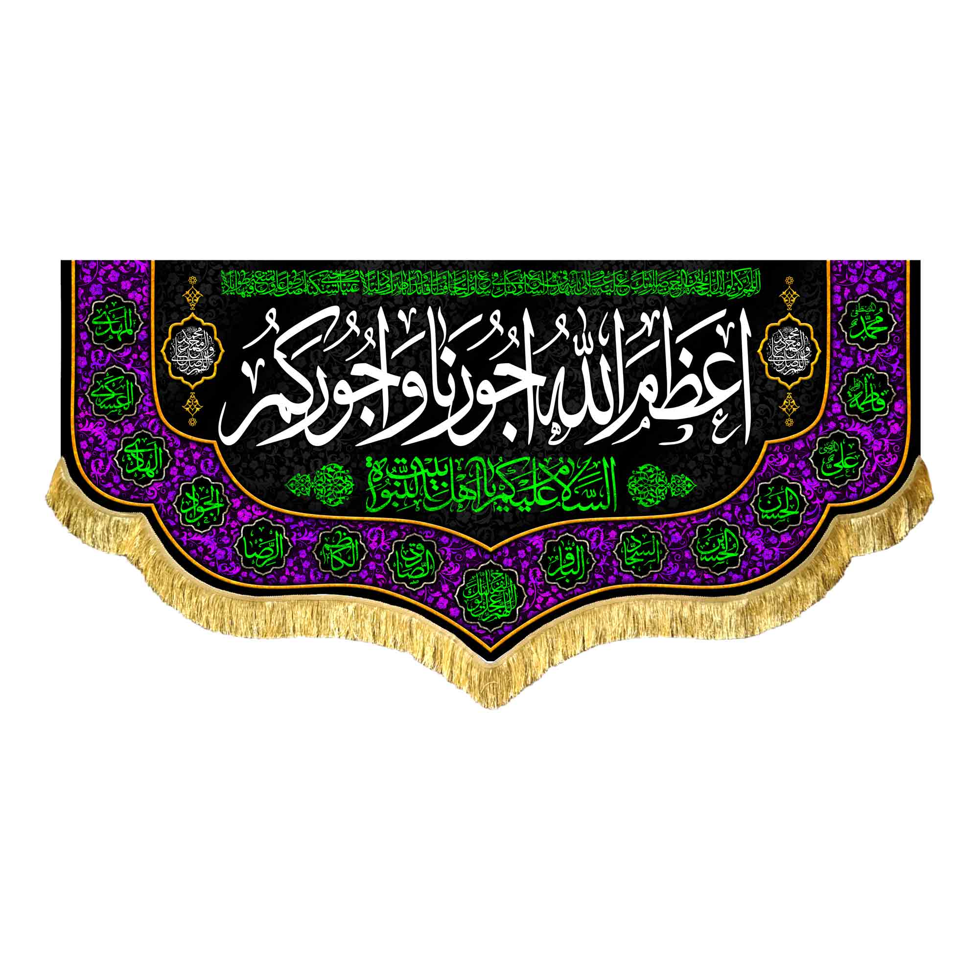 کتیبه ( دکور ) مخمل اعظم الله اجورنا و اجورکم به همراه اسامی مبارک چهارده معصوم (ع) ، السلام علیکم یا اهل بیت النبوه ، اللهم عجل لولیک الفرج ، صلوات ، دعای سلامتی امام زمان (عج) که با طراحی جدید در ابعاد مختلف قابل سفارش است. استفاده شده از پارچه مخمل درجه یک قابل شستشو و با بهترین کیفیت چاپ که همراه با دور دوزی ، ریشه دوزی و بندینک آویز می باشد. این محصول از طراحی تا چاپ به طور کامل در انتشارات مشهور به تولید رسیده است.