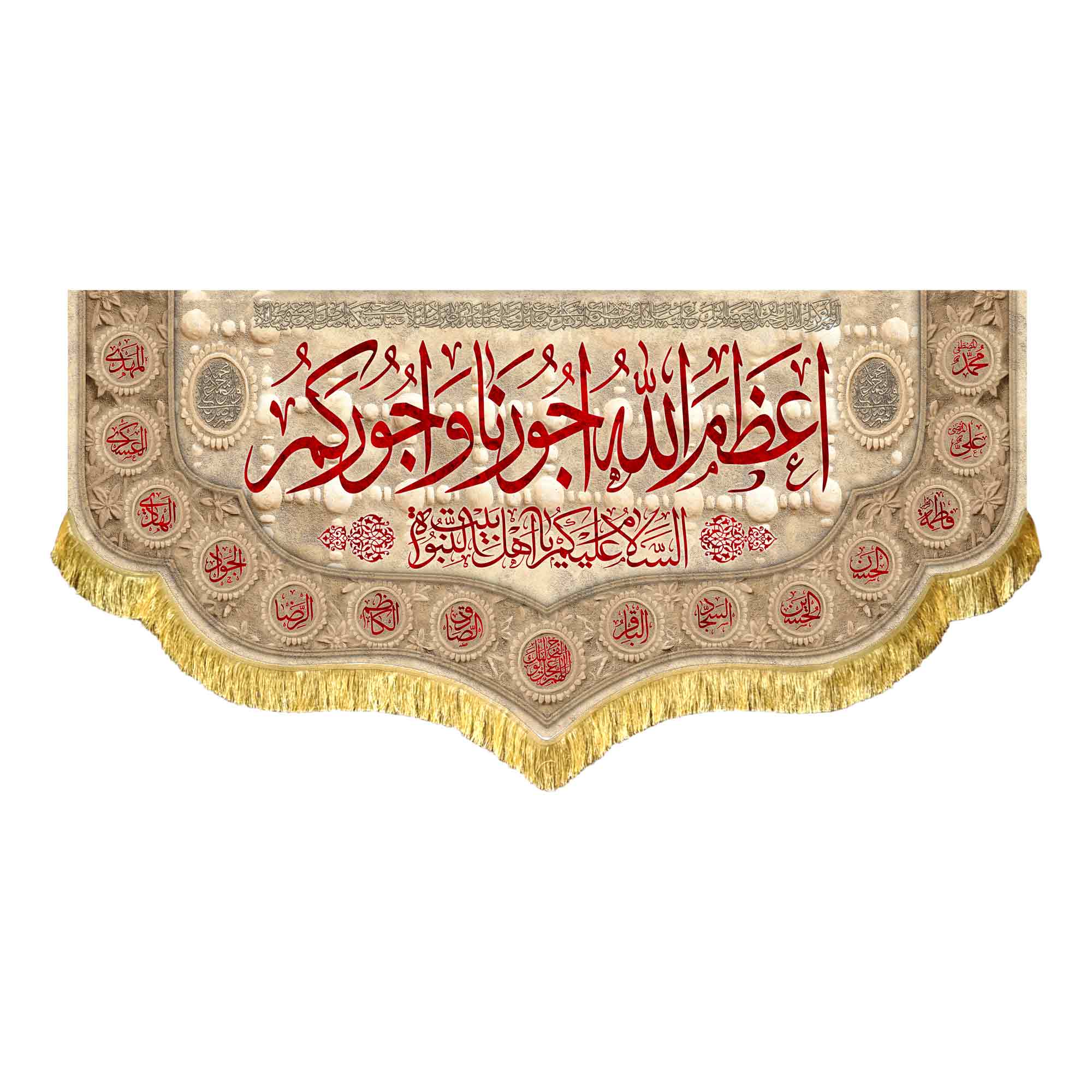 کتیبه ( دکور ) مخمل اعظم الله اجورنا و اجورکم به همراه اسامی مبارک چهارده معصوم (ع) ، السلام علیکم یا اهل بیت النبوه ، اللهم عجل لولیک الفرج ، صلوات ، دعای سلامتی امام زمان (عج) که با طراحی جدید در ابعاد مختلف قابل سفارش است. استفاده شده از پارچه مخمل درجه یک قابل شستشو و با بهترین کیفیت چاپ که همراه با دور دوزی ، ریشه دوزی و بندینک آویز می باشد. این محصول از طراحی تا چاپ به طور کامل در انتشارات مشهور به تولید رسیده است.
