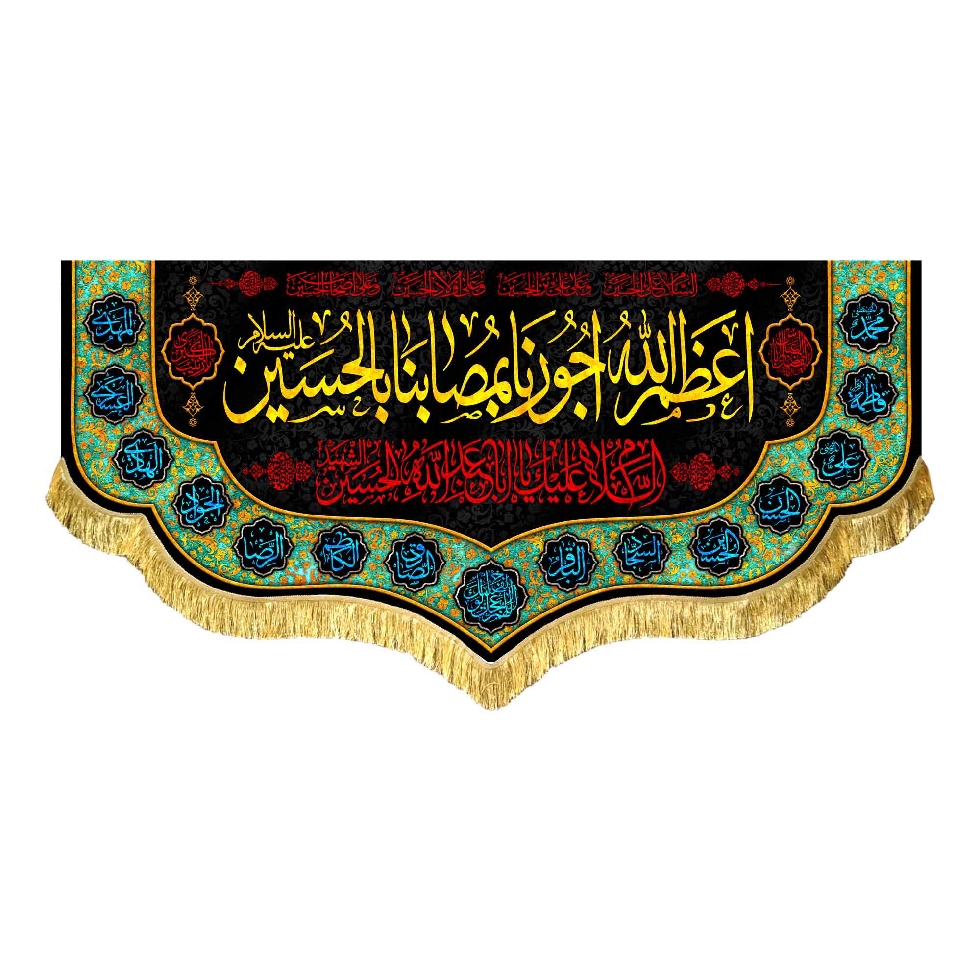 کتیبه ( دکور ) مخمل اعظم الله اجورنا بمصابنا بالحسین ( أعظَمَ اللهُ اجورَنا بمُصابِنا بِالحُسَینِ ) به همراه اسامی مبارک چهارده معصوم (ع) ، السلام علیک یا اباعبدالله الحسین الشهید (ع) ، یا زینب کبری (س) ، یا ابوالفضل العباس (ع) ، اللهم عجل لولیک الفرج ، چهار سلام زیارت عاشورا که با طراحی جدید در ابعاد مختلف قابل سفارش است. استفاده شده از پارچه مخمل درجه یک قابل شستشو و با بهترین کیفیت چاپ که همراه با دور دوزی ، ریشه دوزی و بندینک آویز می باشد. این محصول از طراحی تا چاپ به طور کامل در انتشارات مشهور به تولید رسیده است.