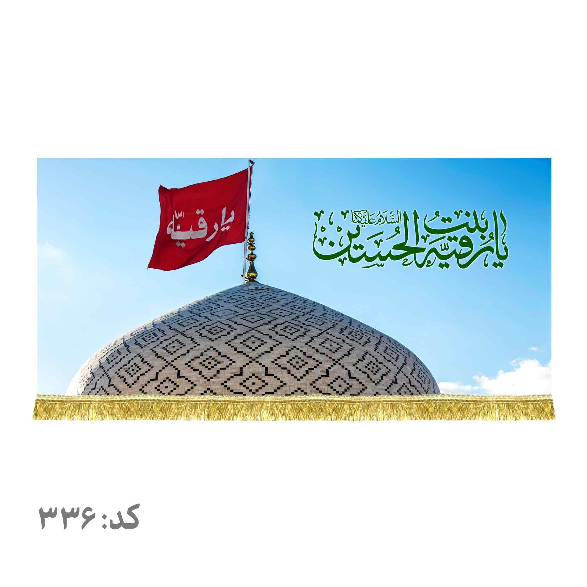 کتیبه ( دکور ) مخمل تصویر گنبد حرم حضرت رقیه بنت الحسین (ع) به همراه ذکر السلام علیکما یا رقیه بنت الحسین (ع) که با طراحی جدید در ابعاد مختلف قابل سفارش است. استفاده شده از پارچه مخمل درجه یک قابل شستشو و با بهترین کیفیت چاپ که همراه با دور دوزی ، ریشه دوزی و بندینک آویز می باشد. این محصول از طراحی تا چاپ به طور کامل در انتشارات مشهور به تولید رسیده است.