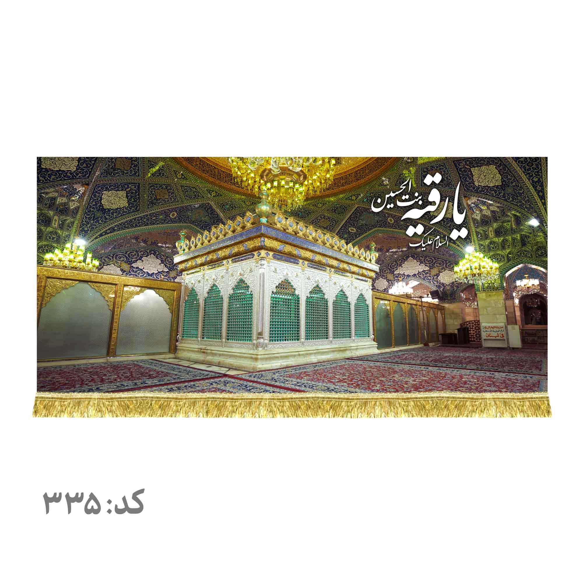 کتیبه ( دکور ) مخمل تصویر ضریح حرم حضرت رقیه بنت الحسین (ع) به همراه ذکر السلام علیک یا رقیه بنت الحسین (ع) که با طراحی جدید در ابعاد مختلف قابل سفارش است. استفاده شده از پارچه مخمل درجه یک قابل شستشو و با بهترین کیفیت چاپ که همراه با دور دوزی ، ریشه دوزی و بندینک آویز می باشد. این محصول از طراحی تا چاپ به طور کامل در انتشارات مشهور به تولید رسیده است.