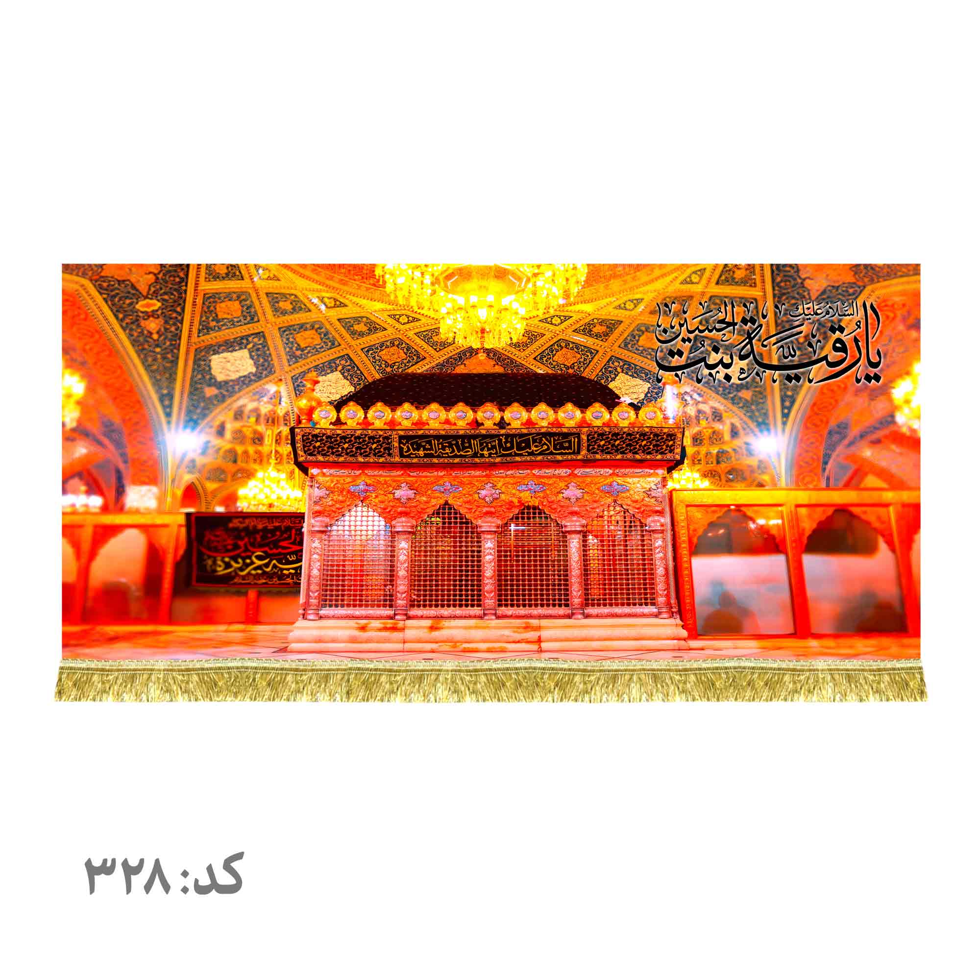 کتیبه ( دکور ) مخمل تصویر ضریح حرم حضرت رقیه بنت الحسین (ع) به همراه ذکر السلام علیک یا رقیه بنت الحسین (ع) که با طراحی جدید در ابعاد مختلف قابل سفارش است. استفاده شده از پارچه مخمل درجه یک قابل شستشو و با بهترین کیفیت چاپ که همراه با دور دوزی ، ریشه دوزی و بندینک آویز می باشد. این محصول از طراحی تا چاپ به طور کامل در انتشارات مشهور به تولید رسیده است.