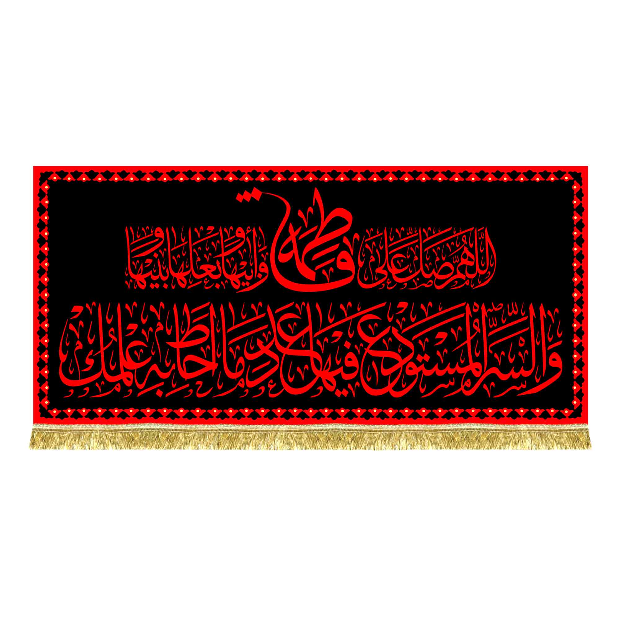 دکور ( کتیبه ) مخمل فاطمیه شهادت حضرت فاطمه زهرا (س) با ذکر صلوات حضرت زهرا (س) که با طراحی جدید سبک عتبه ( حرم ) در ابعاد مختلف قابل سفارش است. استفاده شده از پارچه مخمل درجه یک قابل شستشو و با بهترین کیفیت چاپ که همراه با دور دوزی ، ریشه دوزی و بندینک آویز می باشد و در مجموعه انتشارات مشهور به تولید رسیده است.