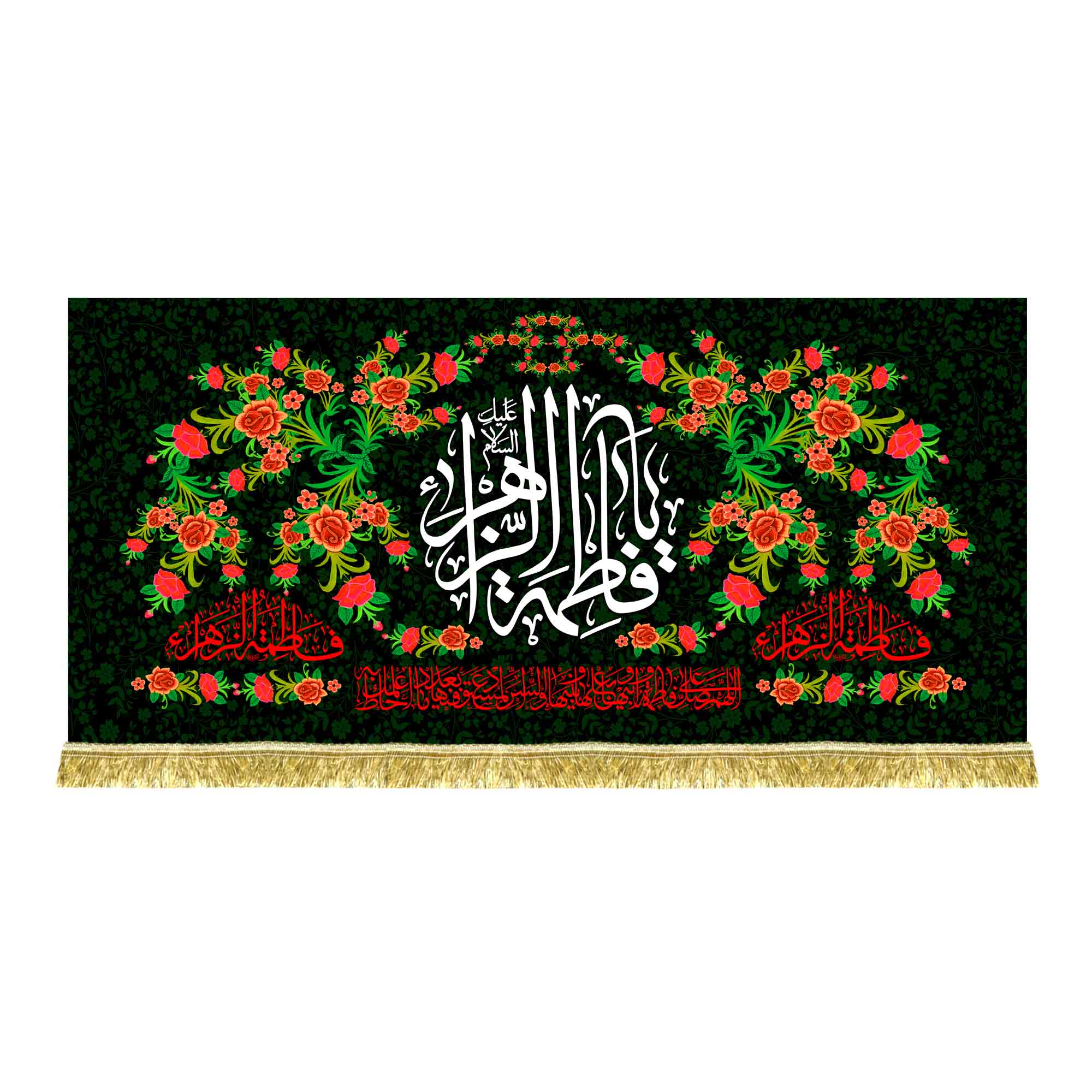 پشت منبری ( کتیبه ) مخمل فاطمیه شهادت حضرت فاطمه زهرا (س) به همراه السلام علیک یا فاطمه الزهرا (س) ، صلوات حضرت زهرا (س) که با طراحی جدید در ابعاد مختلف قابل سفارش است. استفاده شده از پارچه مخمل درجه یک قابل شستشو و با بهترین کیفیت چاپ که همراه با دور دوزی ، ریشه دوزی و بندینک آویز می باشد و در مجموعه انتشارات مشهور به تولید رسیده است.