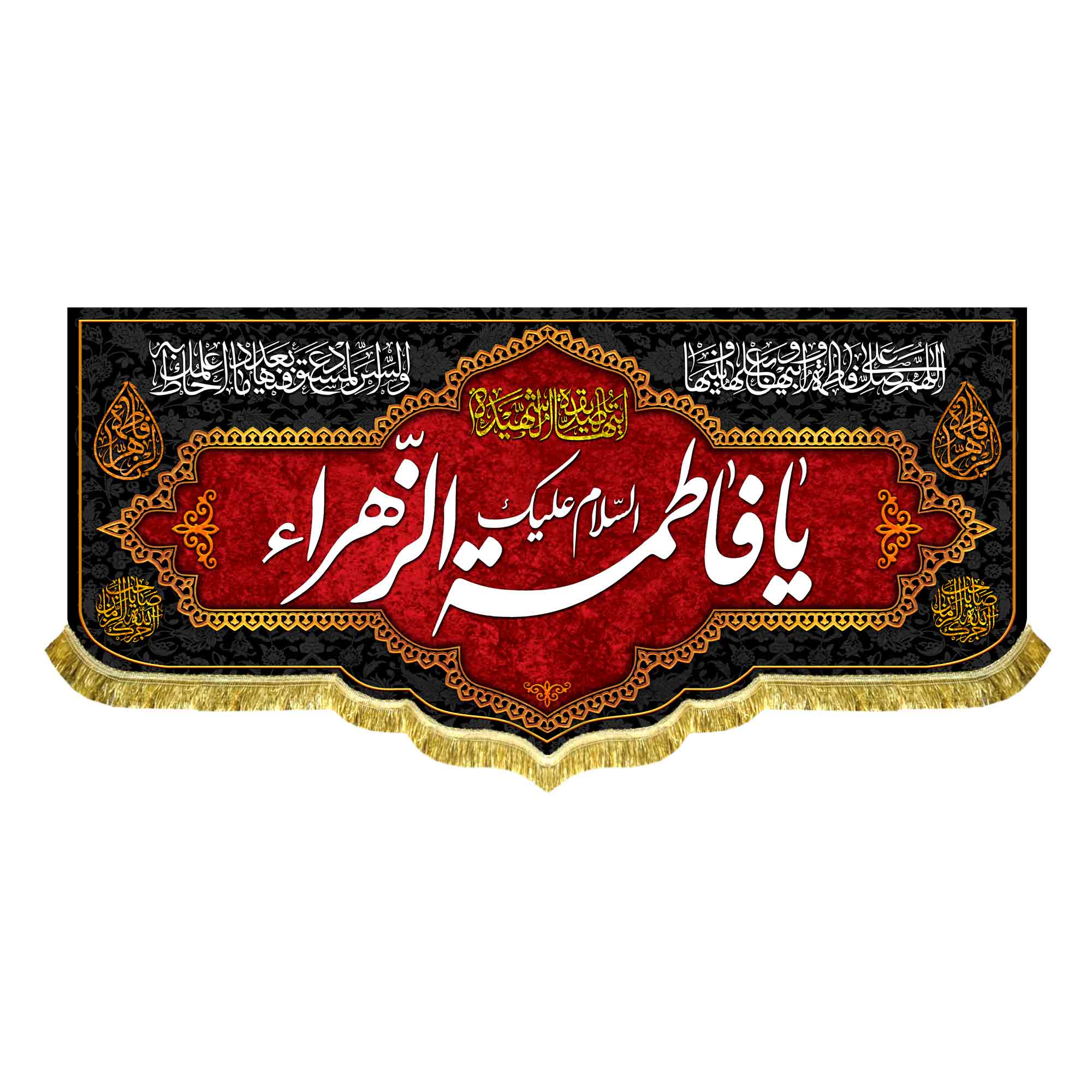 دکور ( کتیبه ) مخمل فاطمیه شهادتی حضرت فاطمه زهرا (س) با ذکر السلام علیک یا فاطمه الزهرا (س) به همراه صلوات حضرت زهرا (س) ، آجرک الله یا صاحب الزمان (عج) ، ایتها الصدیقه الشهیده که با طراحی جدید در ابعاد مختلف قابل سفارش است. استفاده شده از پارچه مخمل درجه یک قابل شستشو و با بهترین کیفیت چاپ که همراه با دور دوزی ، ریشه دوزی و بندینک آویز می باشد و در مجموعه انتشارات مشهور به تولید رسیده است.