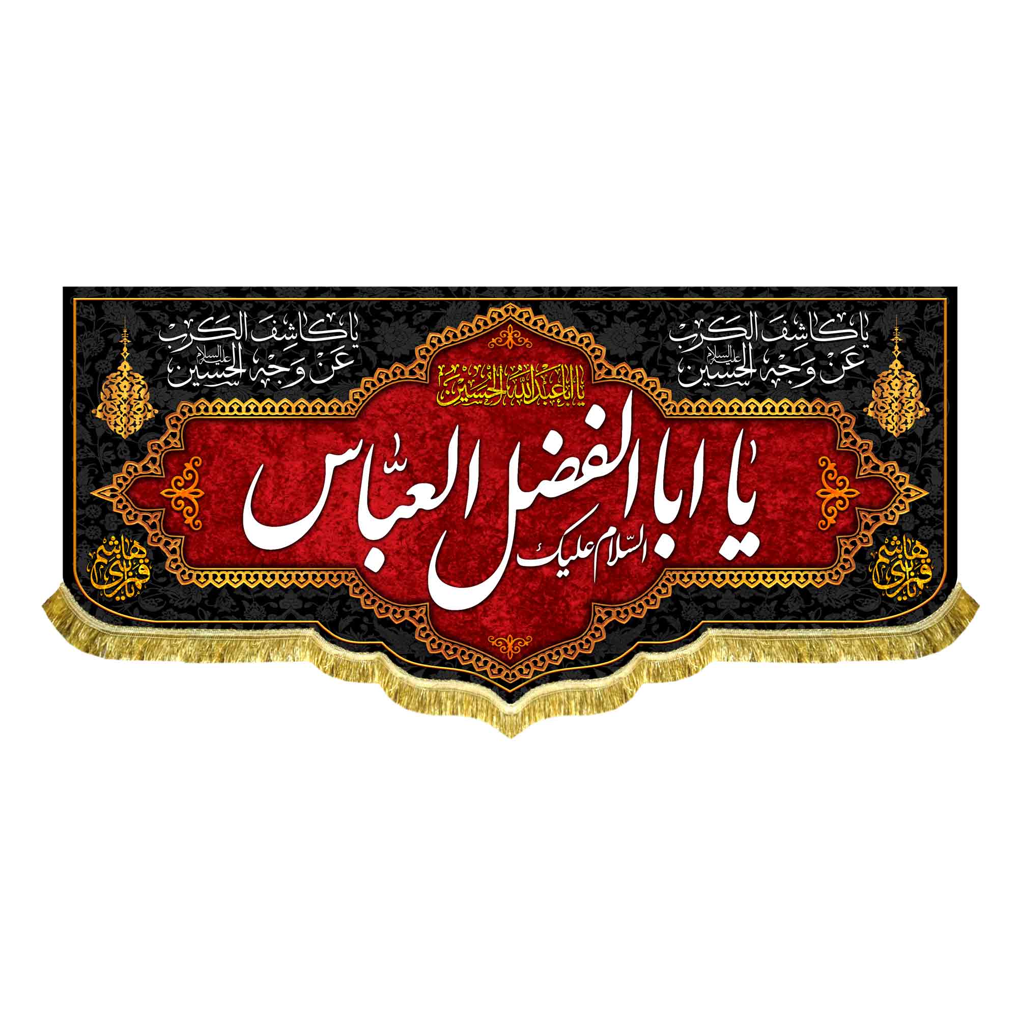 دکور ( کتیبه ) مخمل ایام محرم و صفر شهادت حضرت عباس (ع) با ذکر السلام علیک یا اباالفضل العباس (ع) به همراه یا اباعبدالله الحسین (ع) ، یا قمر بنی هاشم ، یا کاشف الکرب عن وجه الحسین که با طراحی جدید در ابعاد مختلف قابل سفارش است. استفاده شده از پارچه مخمل درجه یک قابل شستشو و با بهترین کیفیت چاپ که همراه با دور دوزی ، ریشه دوزی و بندینک آویز می باشد و در مجموعه انتشارات مشهور به تولید رسیده است.