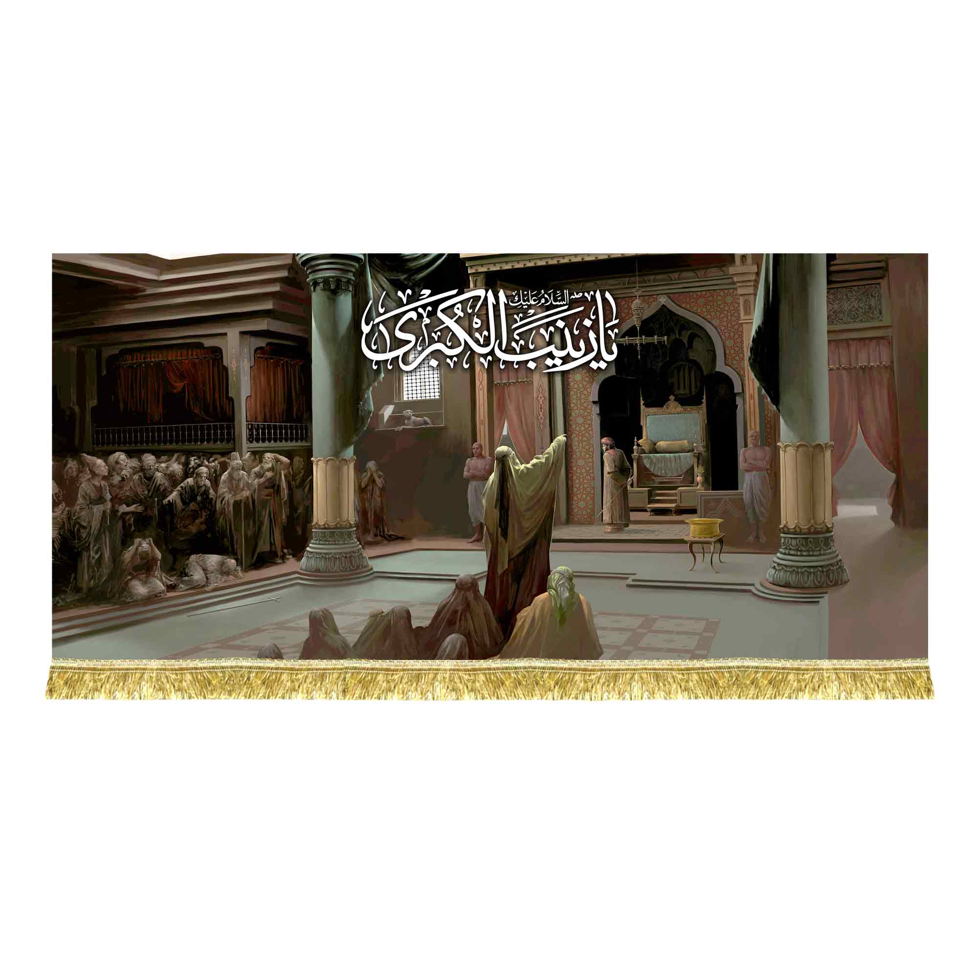 کتیبه ( دکور ) مخمل نقاشی خطبه حضرت زینب (س) و کاروان اسراء در قصر یزید به همراه ذکر السلام علیک یا زینب کبری (س) که با طراحی جدید در ابعاد مختلف قابل سفارش است. استفاده شده از پارچه مخمل درجه یک قابل شستشو و با بهترین کیفیت چاپ که همراه با دور دوزی ، ریشه دوزی و بندینک آویز می باشد و در مجموعه انتشارات مشهور به تولید رسیده است.