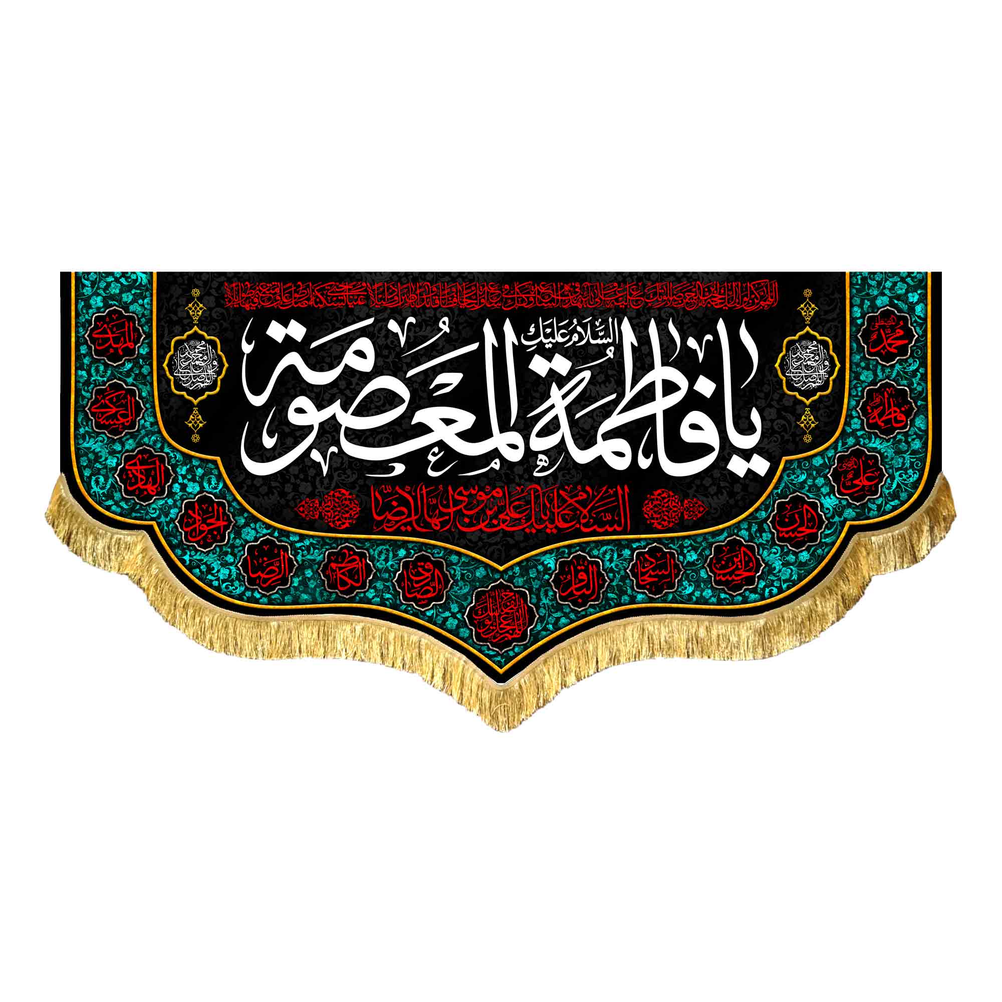 دکور ( کتیبه ) مخمل شهادت حضرت معصومه (س) با ذکر السلام علیک یا فاطمه المعصومه (س) به همراه اسامی مبارک چهارده معصوم (ع) ، السلام علیک یا علی بن موسی الرضا (ع) ، دعای سلامتی امام زمان (عج) ، صلوات ( اللهم صل علی محمد و آل محمد و عجل فرجهم ) ، اللهم عجل لولیک الفرج که با طراحی جدید در ابعاد مختلف قابل سفارش است. استفاده شده از پارچه مخمل درجه یک قابل شستشو و با بهترین کیفیت چاپ که همراه با دور دوزی ، ریشه دوزی و بندینک آویز می باشد. این محصول از طراحی تا چاپ به طور کامل در مجموعه انتشارات مشهور به تولید رسیده است.