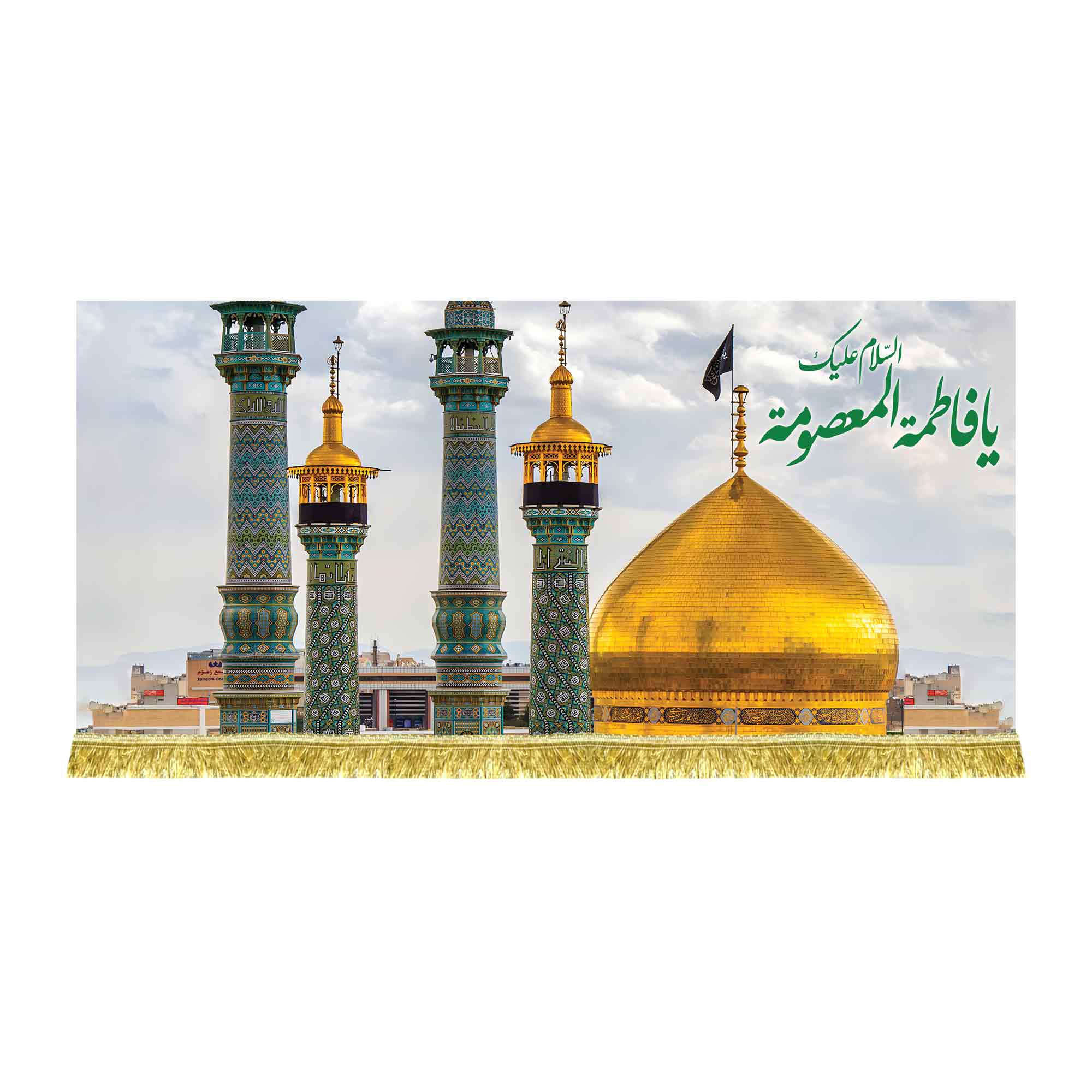 دکور ( کتیبه ) مخمل تصویر حرم حضرت معصومه (س) با ذکر السلام علیک یا فاطمه المعصومه (س) که با طراحی جدید در ابعاد مختلف قابل سفارش است. استفاده شده از پارچه مخمل درجه یک قابل شستشو و با بهترین کیفیت چاپ که همراه با دور دوزی ، ریشه دوزی و بندینک آویز می باشد و در مجموعه انتشارات مشهور به تولید رسیده است.
