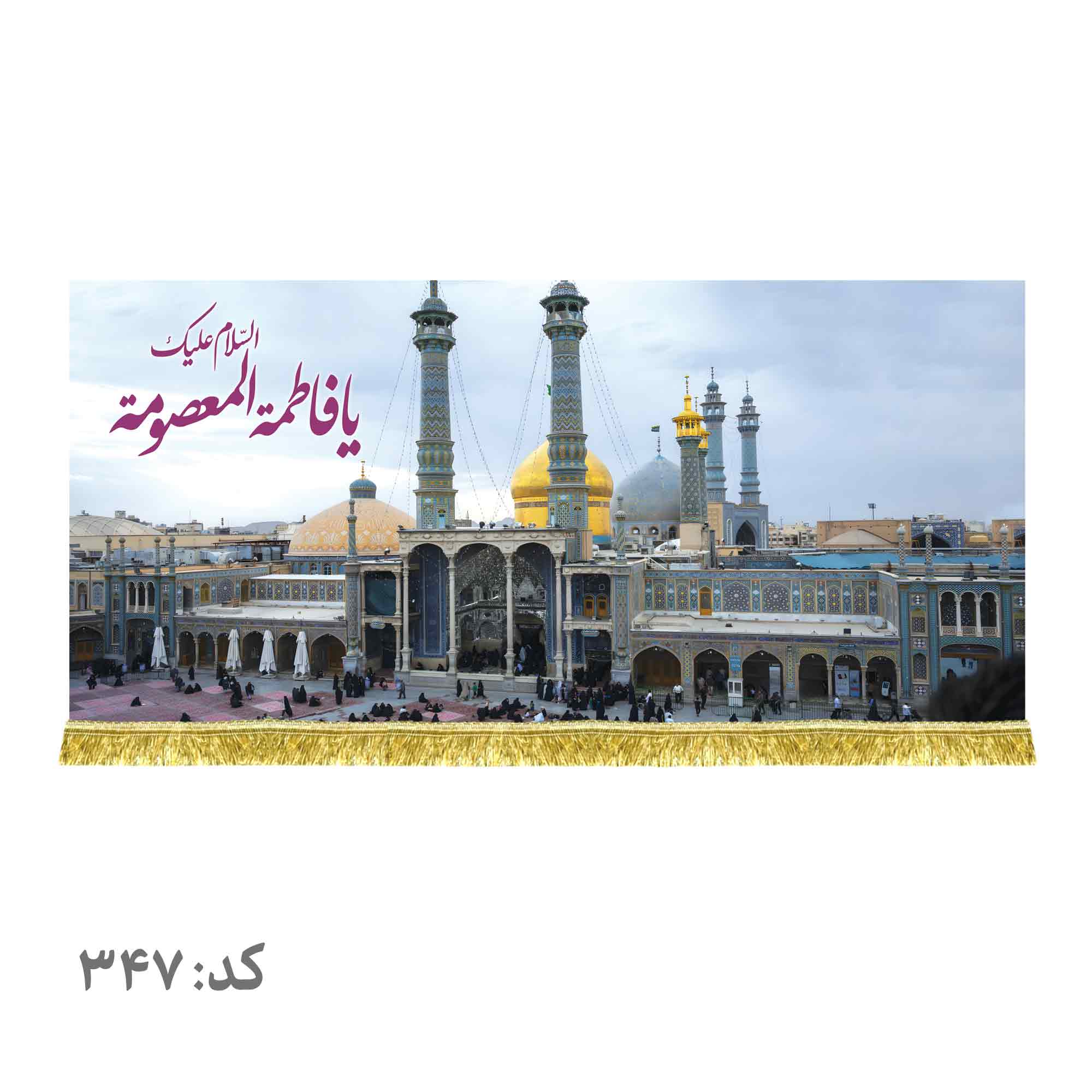 دکور ( کتیبه ) مخمل تصویر حرم حضرت معصومه (س) با ذکر السلام علیک یا فاطمه المعصومه (س) که با طراحی جدید در ابعاد مختلف قابل سفارش است. استفاده شده از پارچه مخمل درجه یک قابل شستشو و با بهترین کیفیت چاپ که همراه با دور دوزی ، ریشه دوزی و بندینک آویز می باشد و در مجموعه انتشارات مشهور به تولید رسیده است.