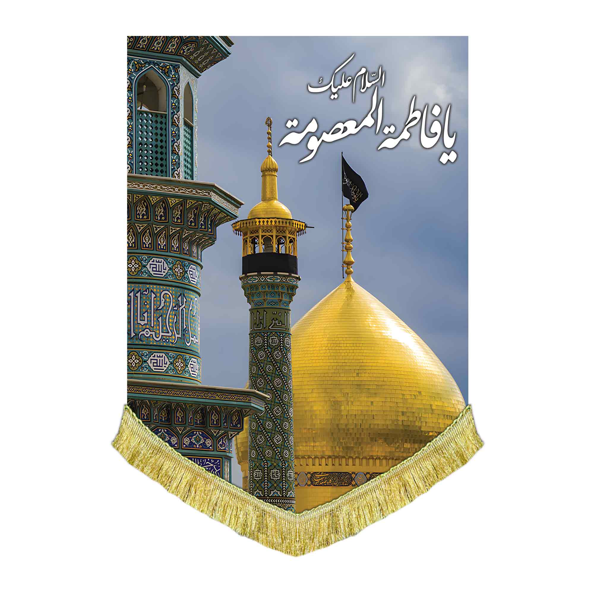 کتیبه ( پرچم ) مخمل عمودی تصویر شهر قم حرم حضرت معصومه (س) به همراه ذکر السلام علیک یا فاطمه المعصومه (س) که با طراحی جدید در ابعاد مختلف قابل سفارش است. استفاده شده از پارچه مخمل درجه یک قابل شستشو و با بهترین کیفیت چاپ که همراه با دور دوزی ، ریشه دوزی و بندینک آویز می باشد و در مجموعه انتشارات مشهور به تولید رسیده است.