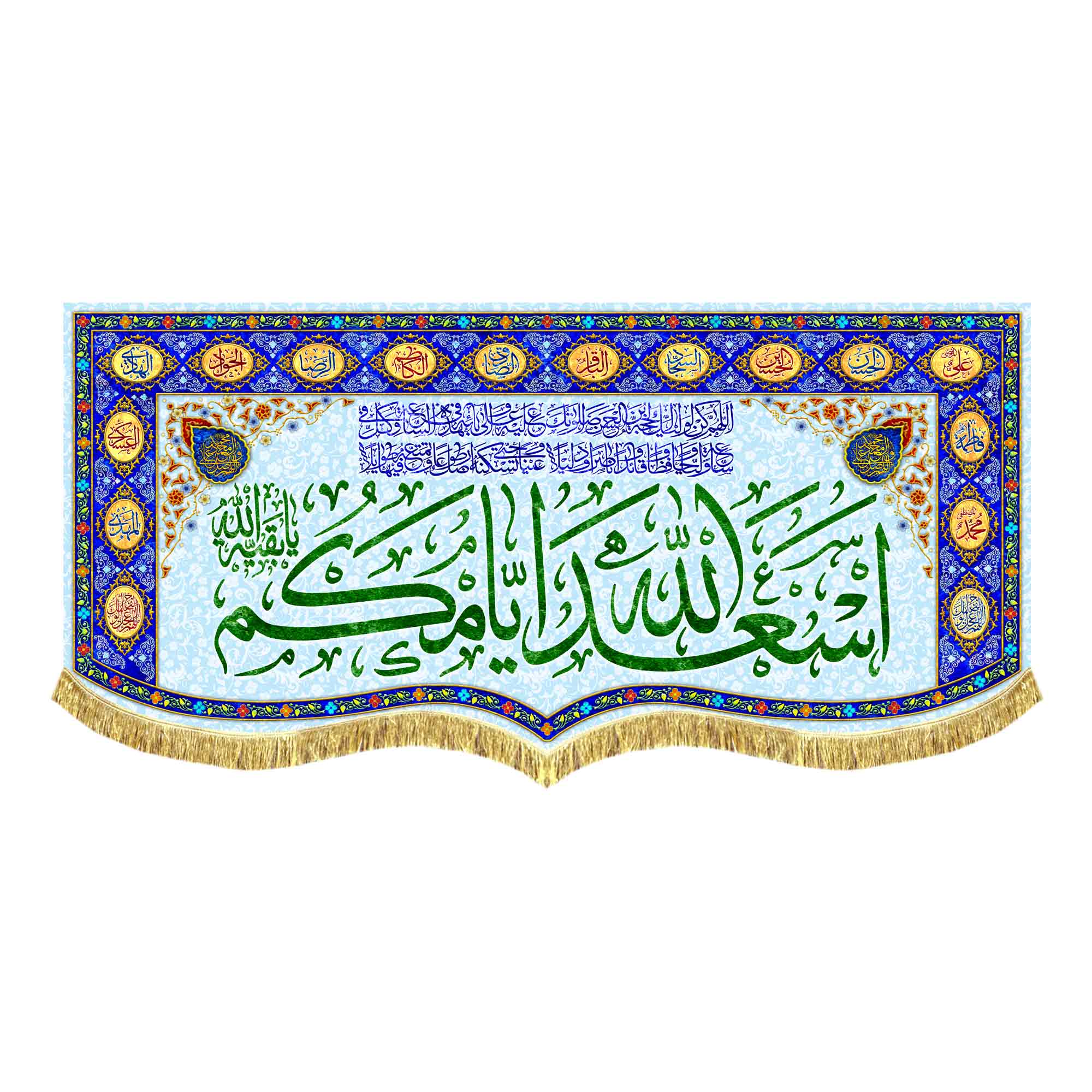 پشت منبری مخمل اسعدالله ایامکم یا بقیه الله به همراه اسامی مبارک چهارده معصوم (ع) ، اللهم صل علی محمد و آل محمد و عجل فرجهم ، اللهم عجل لولیک الفرج ، دعای سلامتی امام زمان (عج) که با طراحی دالبر و رنگبندی متنوع در ابعاد مختلف قابل سفارش است. استفاده شده از پارچه مخمل درجه یک قابل شستشو و با بهترین کیفیت چاپ که همراه با دور دوزی ، ریشه دوزی و بندینک آویز می باشد. این محصول از طراحی تا چاپ به طور کامل در مجموعه انتشارات مشهور به تولید رسیده است.