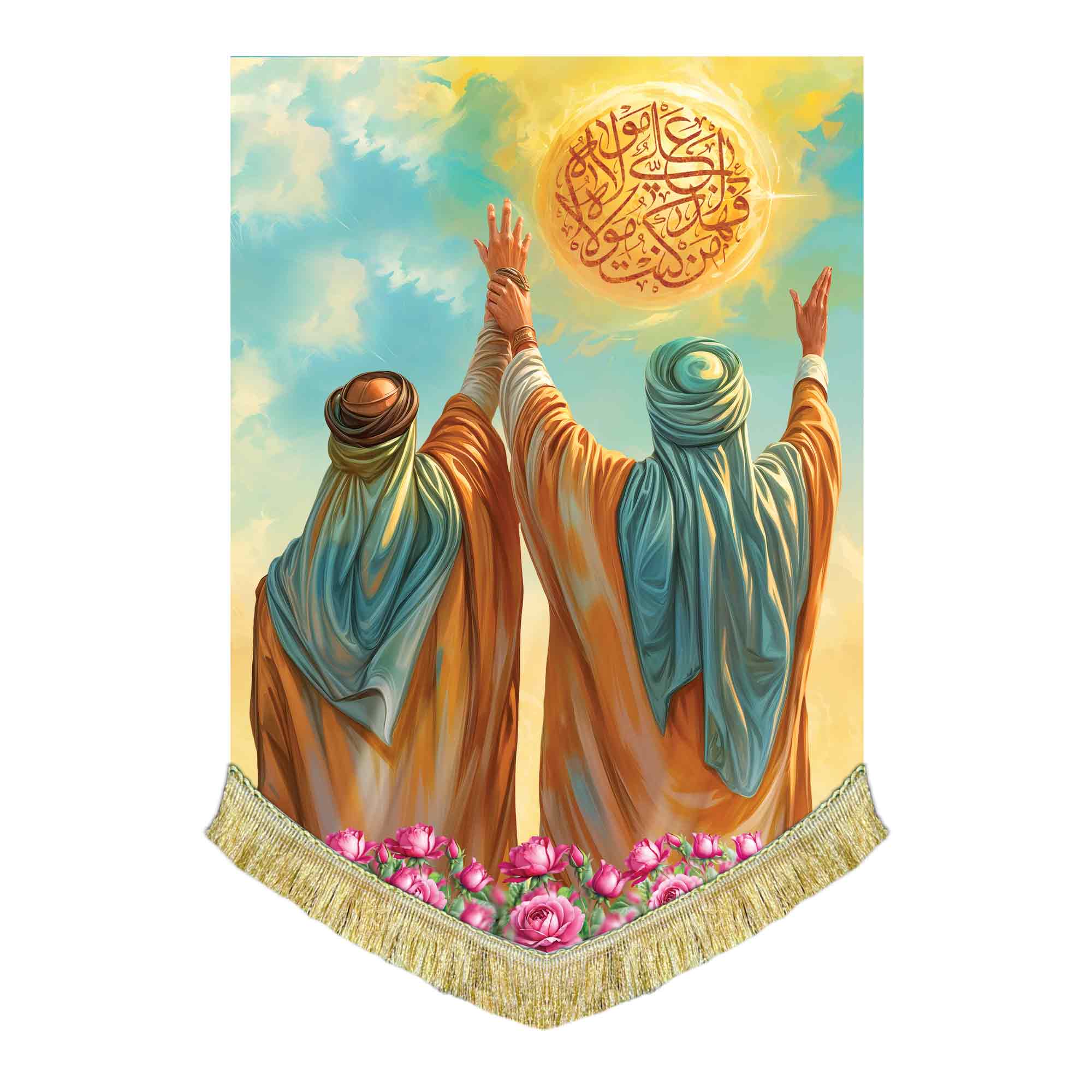 کتیبه ( پرچم ) مخمل عمودی نقاشی غدیر خم به همراه ذکر مَنْ كُنْتُ مَوْلَاهُ فَهَذَا عَلِيٌّ مَوْلَاهُ که با طراحی جدید دالبر در ابعاد مختلف قابل سفارش است. استفاده شده از پارچه مخمل درجه یک قابل شستشو و با بهترین کیفیت چاپ که همراه با دور دوزی ، ریشه دوزی و بندینک آویز می باشد که در مجموعه انتشارات مشهور به تولید رسیده است.