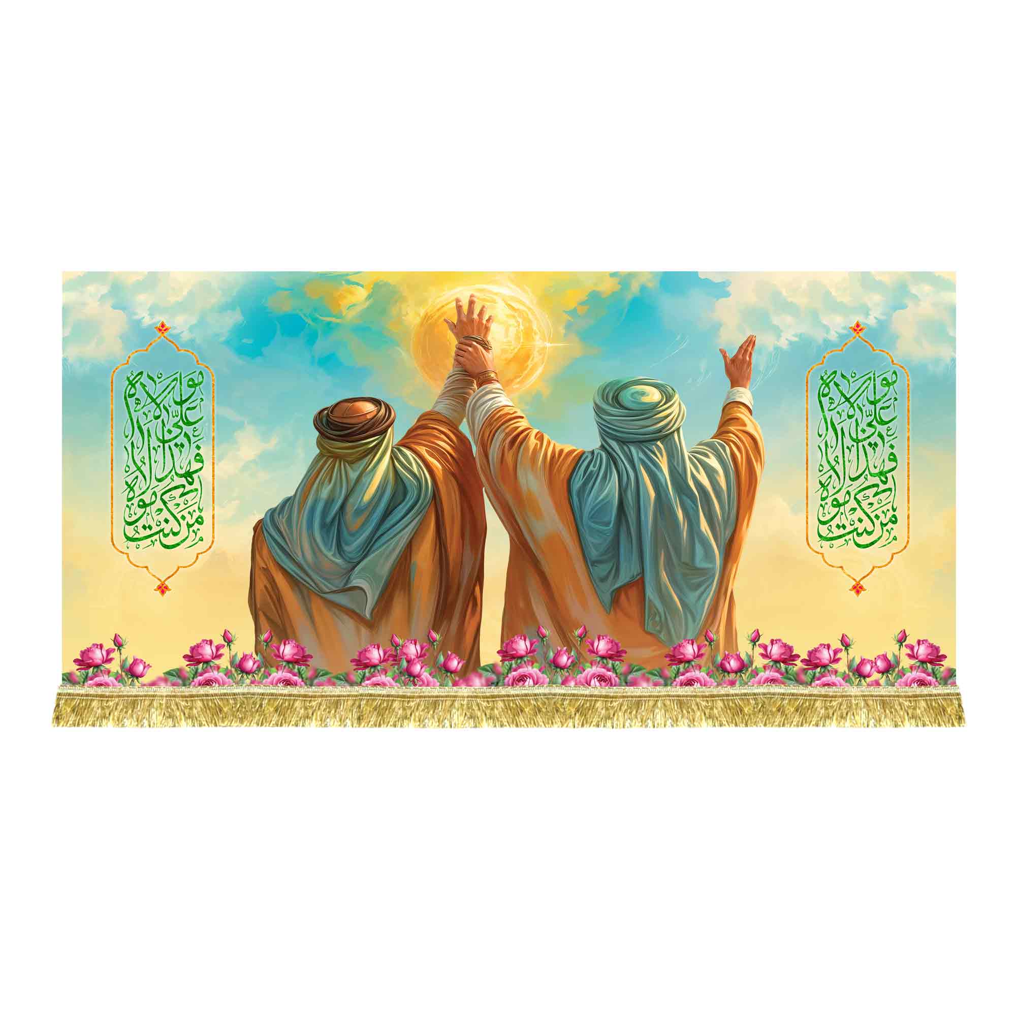 دکور ( کتیبه ) مخمل نقاشی عید غدیر خم به همراه ذکر مَنْ كُنْتُ مَوْلَاهُ فَهَذَا عَلِيٌّ مَوْلَاهُ که با طراحی جدید در ابعاد مختلف قابل سفارش است. استفاده شده از پارچه مخمل درجه یک قابل شستشو و با بهترین کیفیت چاپ که همراه با دور دوزی ، ریشه دوزی و بندینک آویز می باشد که در مجموعه انتشارات مشهور به تولید رسیده است.